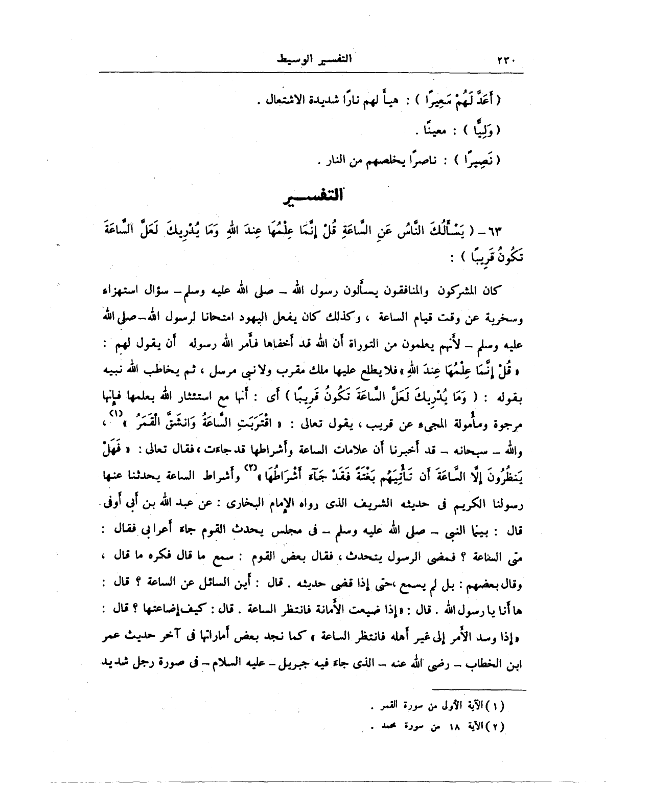 كان المشركون والمنافقون يسأَلون رسول الله - صلى الله عليه وسلم - سؤال استهزاء وسخرية عن وقت قيام الساعة، وكذلك كان يفعل اليهود امتحانا لرسول الله - صلى الله عليه وسلم - لأَنهم يعلمون من التوراة أَن الله قد أَخفاها فأَمر الله رسوله أَن يقول لهم: {قُلْ إِنَّمَا عِلْمُهَا عِنْدَ اللَّهِ} فلا يطلع عليها ملك مقرب ولا نبي مرسل، ثم يخاطب الله نبيه بقوله: {وَمَا يُدْرِيكَ لَعَلَّ السَّاعَةَ تَكُونُ قَرِيبًا} أَي: أَنها مع استئثار الله بعلمها فإنها مرجوة ومأْمولة المجيءِ عن قريب، يقول تعالى: {اقْتَرَبَتِ السَّاعَةُ وَانْشَقَّ الْقَمَرُ} (¬1)، والله - سبحانه - قد أَخبرنا أَن علامات الساعة وأشراطها قد جاءَت، فقال تعالى: {فَهَلْ يَنْظُرُونَ إِلَّا السَّاعَةَ أَنْ تَأْتِيَهُمْ بَغْتَةً فَقَدْ جَاءَ أَشْرَاطُهَا} (¬2) وأَشراط الساعة يحدثنا عنها رسولنا الكريم في حديثه الشريف الذي رواه الإِمام البخاري: عن عبد الله بن أَبي أَوفى قال: بينما النبي - صلى الله عليه وسلم - في مجلس يحدث القوم جاءَ أَعرابي فقال: متى الساعة؟ فمضى الرسول يتحدث، فقال بعض القوم: سمع ما قال فكره ما قال، وقال بعضهم: بل لم يسمع، حتى إذا قضى حديثه. قال: أَين السائل عن الساعة؟ قال: ها أَنا يا رسول الله. قال: "إذا ضيعت الأمانة فانتظر الساعة. قال: كيف إضاعتها؟ قال: "إذا وسد الأَمر إلى غير أهله فانتظر الساعة" كما نجد بعض أَماراتها في آخر حديث عمر ابن الخطاب - رضي الله عنه - الذي جاءَ فيه جبريل - عليه السلام - في صورة رجل شديد