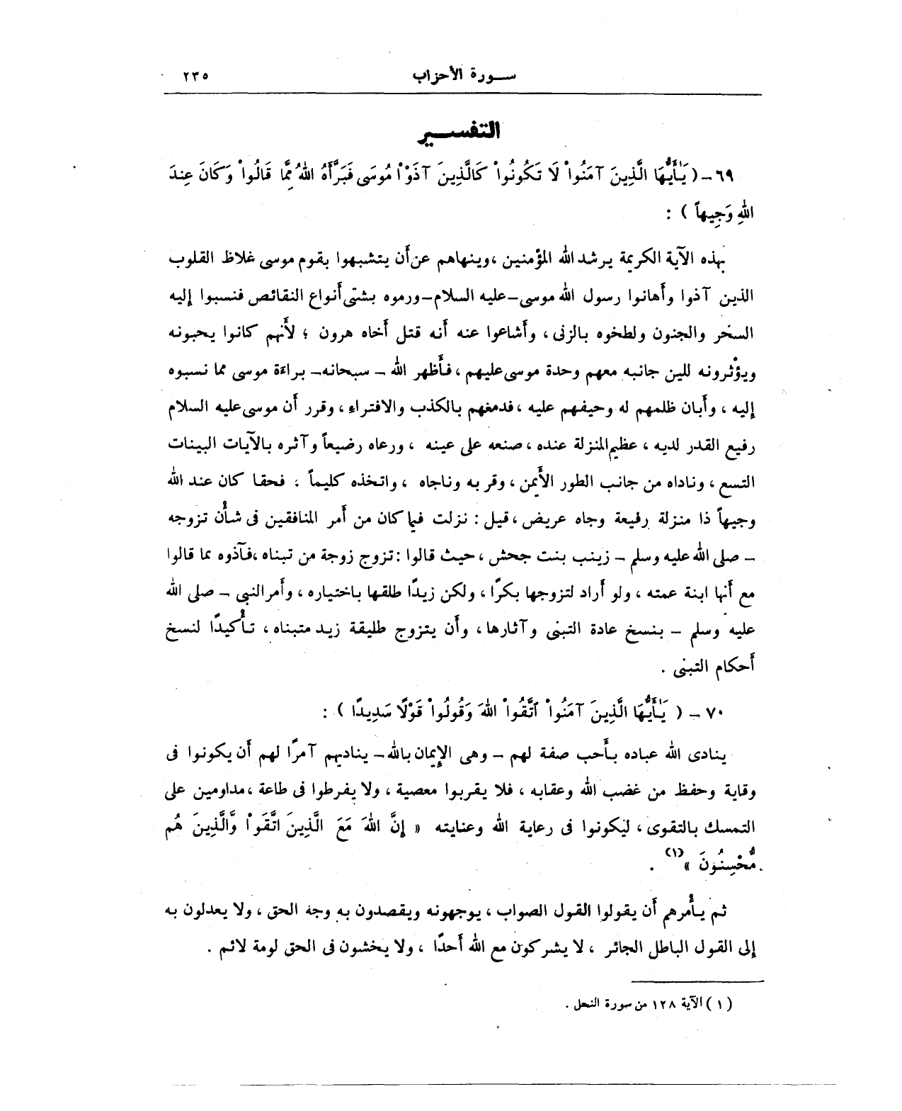 بهذه الآية الكريمة يرشد الله المؤْمنين، وينهاهم عن أَن يتشبهوا بقوم موسى غلاظ القلوب الذين آذوا وأهانوا رسول الله موسى - عليه السلام - ورموه بشتى أَنواع النقائص فنسبوا إليه السحر والجنون ولطخوه بالزنى، وأَشاعوا عنه أَنه قتل أخاه هرون؛ لأَنهم كانوا يحبونه ويؤْثرونه للين جانبه معهم وحدة موسى عليهم، فأَظهر الله - سبحانه - براءة موسى مما نسبوه إليه، وأَبان ظلمهم له وحيفهم عليه، فدمغهم بالكذب والافتراءِ، وقرر أن موسى عليه السلام رفيع القدر لديه، عظيم المنزلة عنده، صنعه على عينه، ورعاه رضيعًا وآثره بالآيات البينات التسع، وناداه من جانب الطور الأيمن، وقربه وناجاه، واتخذه كليمًا، فحقا كان عند الله وجيهًا ذا منزلة رفيعة وجاه عريض، قيل: نزلت فيما كان من أَمر المنافقين في شأْن تزوجه - صلى الله عليه وسلم - زينب بنت جحش، حيث قالوا: تزوج زوجة من تبناه، فآذوه مما قالوا مع أَنها ابنة عمته، ولو أراد لتزوجها بكرًا، ولكن زيدًا طلقها باختياره، وأَمر النبي - صلى الله عليه وسلم - بنسخ عادة التبني وآثارها، وأن يتزوج طليقة زيد متبناه، تأْكيدًا لنسخ أحكام التبني.
