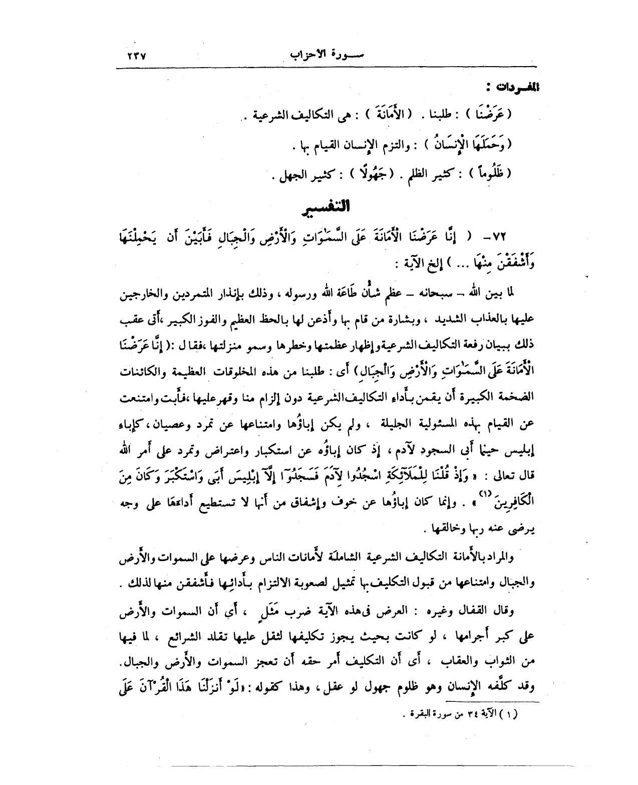 72 - {إِنَّا عَرَضْنَا الْأَمَانَةَ عَلَى السَّمَاوَاتِ وَالْأَرْضِ وَالْجِبَالِ فَأَبَيْنَ أَنْ يَحْمِلْنَهَا وَأَشْفَقْنَ مِنْهَا .. } إلخ الآية: