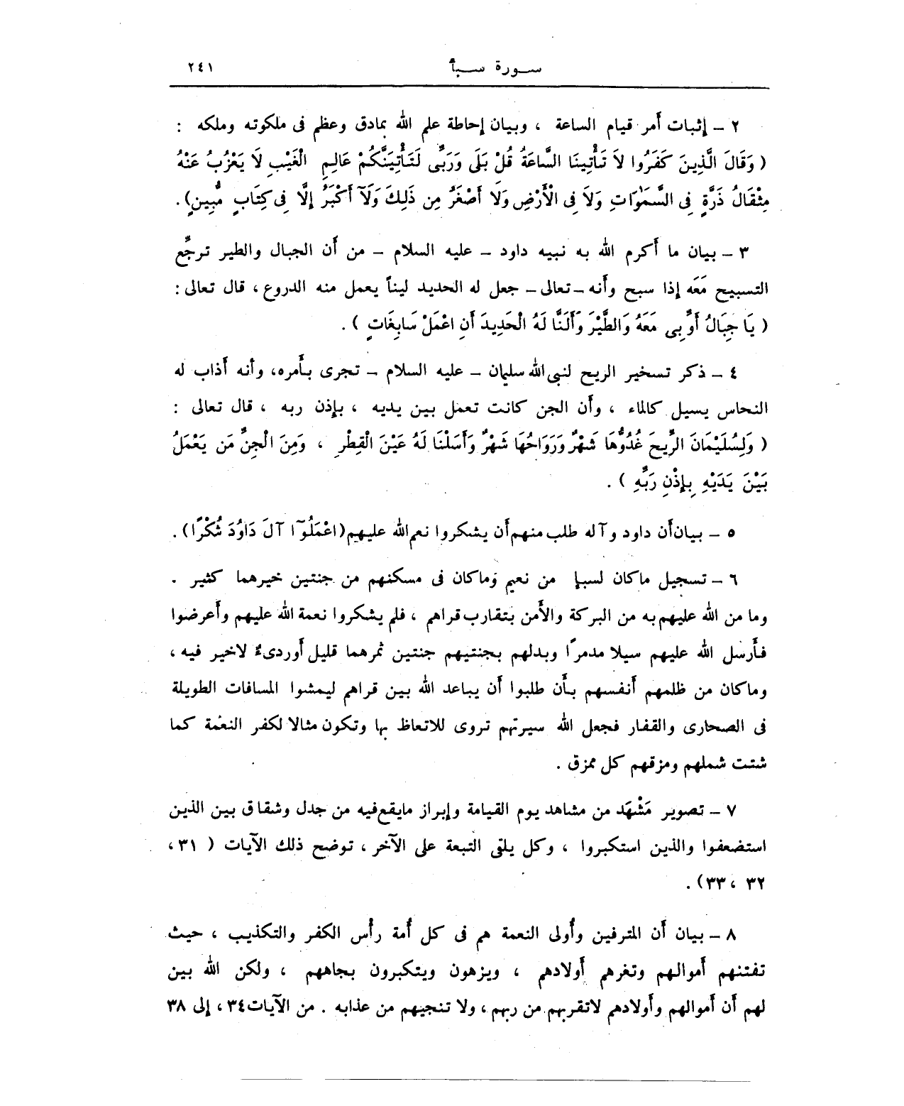 7 - تصوير مَشْهَد من مشاهد يوم القيامة وإبراز ما يقع فيه من جدل وشقاق بين الذين استضعفوا والذين استكبروا، وكل يلقي التبعة على الآخر، توضح ذلك الآيات (31، 32، 33).