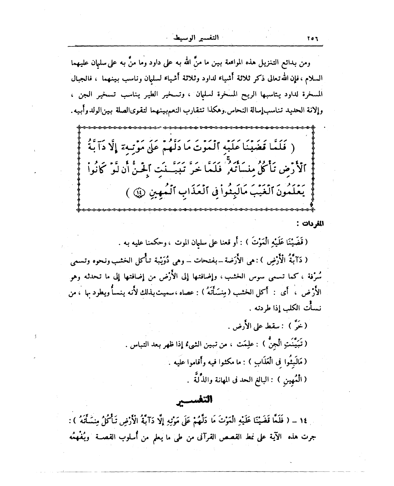 {فَلَمَّا قَضَيْنَا عَلَيْهِ الْمَوْتَ مَا دَلَّهُمْ عَلَى مَوْتِهِ إِلَّا دَابَّةُ الْأَرْضِ تَأْكُلُ مِنْسَأَتَهُ فَلَمَّا خَرَّ تَبَيَّنَتِ الْجِنُّ أَنْ لَوْ كَانُوا يَعْلَمُونَ الْغَيْبَ مَا لَبِثُوا فِي الْعَذَابِ الْمُهِينِ (14)}