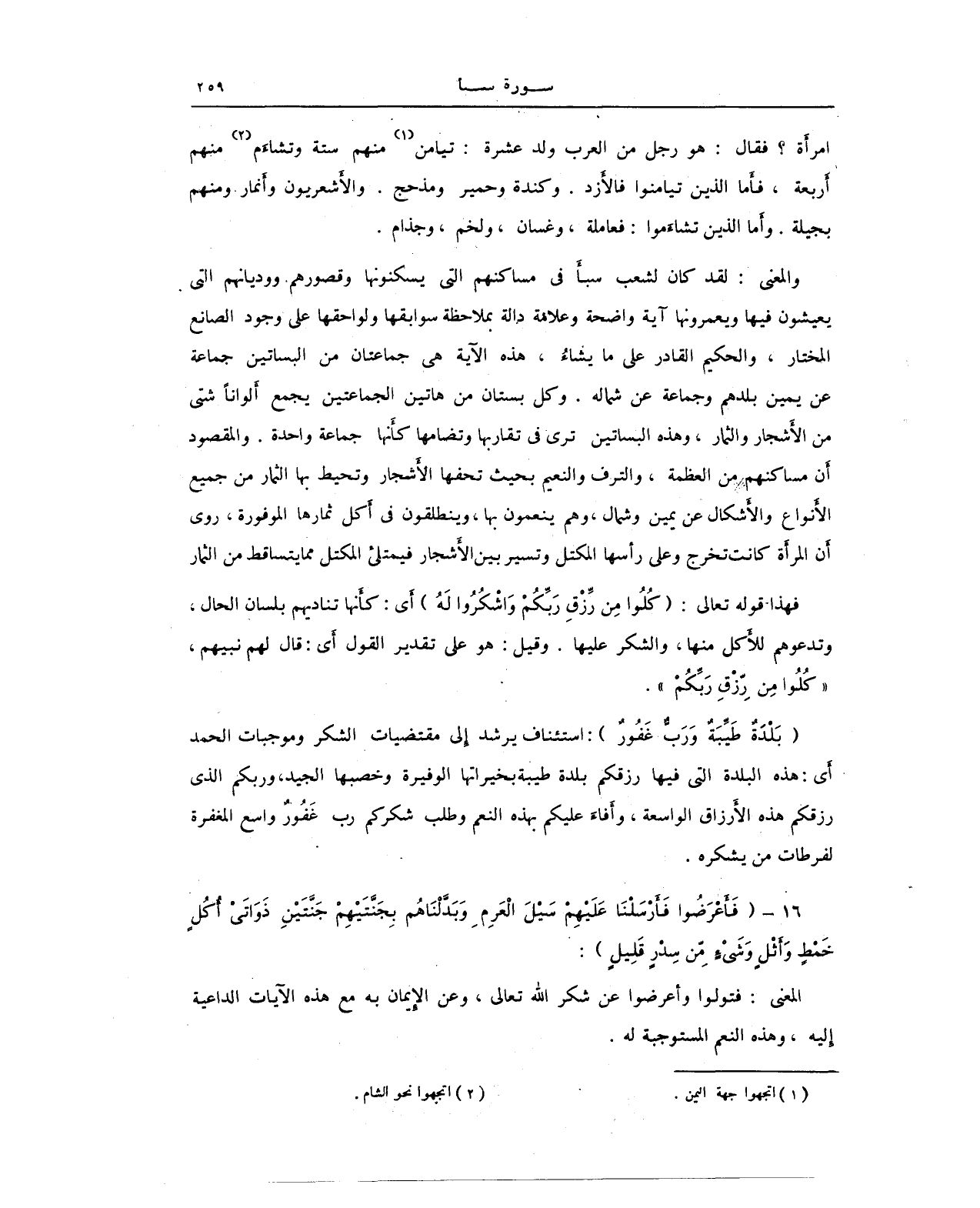 والمعنى: لقد كان لشعب سبأَ في مساكنهم التي يسكنونها وقصورهم. ووديانهم التي يعيشون فيها ويعمرونها آية واضحة وعلامة دالة بملاحظة سوابقها ولواحقها على وجود الصانع المختار، والحكيم القادر على ما يشاءُ، هذه الآية هي جماعتان من البساتين جماعة عن يمين بلدهم وجماعة عن شماله. وكل بستان من هاتين الجماعتين يجمع أَلوانًا شتى من الأَشجار والثمار، وهذه البساتين ترى في تقاربها وتضامها كأَنها جماعة واحدة. والمقصود أَن مساكنهم من العظمة، والترف والنعيم بحيث تحفها الأَشجار وتحيط بها الثمار من جميع الأنواع والأَشكال عن يمين وشمال، وهم ينعمون بها، وينطلقون في أَكل ثمارها الموفورة، روي أَن المرأَة كانت تخرج وعلى رأسها المكتل وتسير بين الأَشجار فيمتليء المكتل مما يتساقط من الثمار فهذا قوله تعالى: {كُلُوا مِنْ رِزْقِ رَبِّكُمْ وَاشْكُرُوا لَهُ} أي: كأَنها تناديهم بلسان الحال، وتدعوهم للأَكل منها، والشكر عليها. وقيل: هو على تقدير القول أَي: قال لهم نبيهم، {كُلُوا مِنْ رِزْقِ رَبِّكُمْ}.