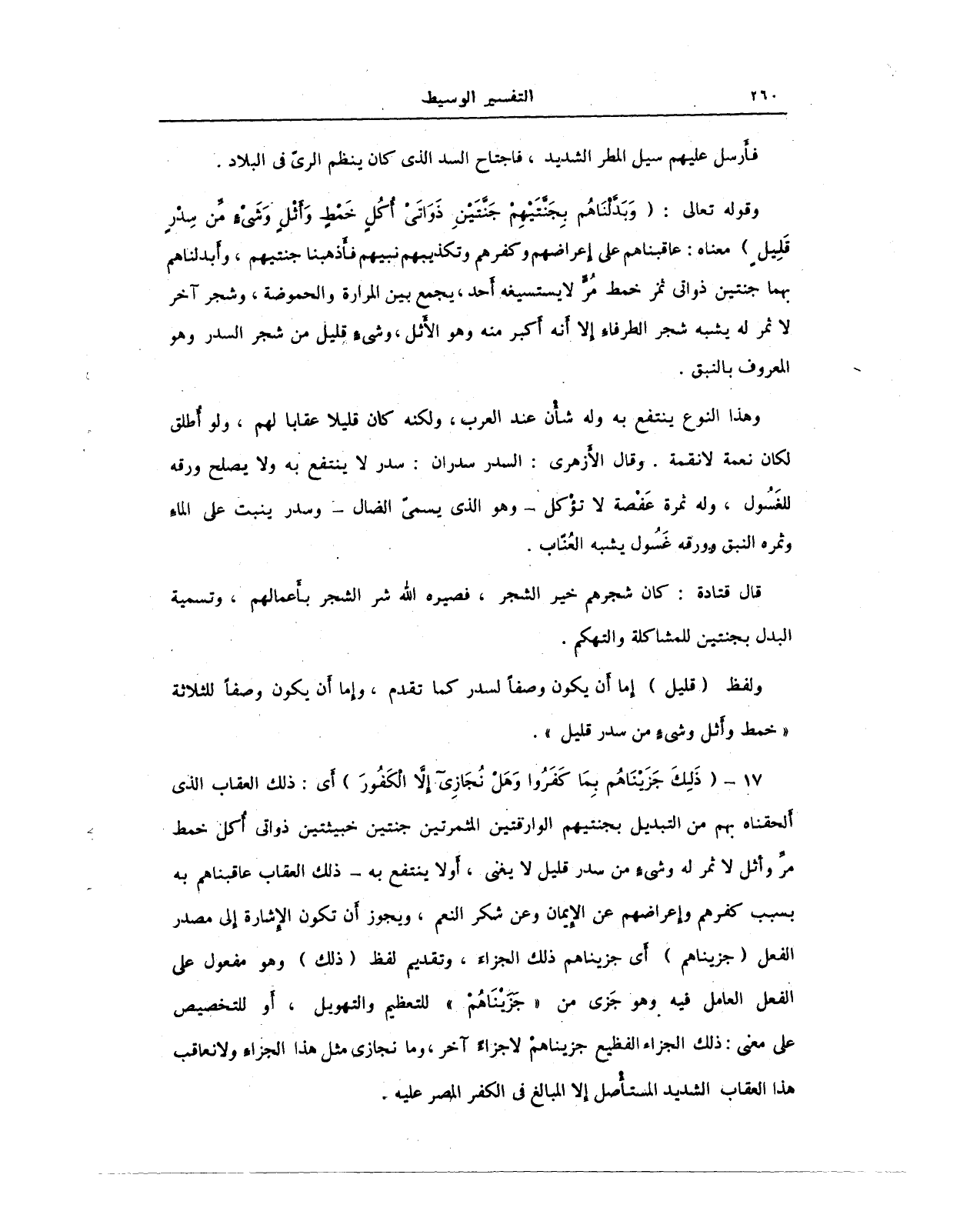وقوله تعالى: {وَبَدَّلْنَاهُمْ بِجَنَّتَيْهِمْ جَنَّتَيْنِ ذَوَاتَيْ أُكُلٍ خَمْطٍ وَأَثْلٍ وَشَيْءٍ مِنْ سِدْرٍ قَلِيلٍ} معناه: عاقبناهم على إعراضهم وكفرهم وتكذيبهم نبيهم فأَذهبنا جنتيهم، وأَبدلناهم بهما جنتين ذواتي ثمر خمط مُرٍّ لا يستسيغه أَحد، يجمع بين المرارة والحموضة، وشجر آخر لا ثمر له يشبه شجر الطرفاء إلا أَنه أَكبر منه وهو الأثل، وشيءٍ قليل من شجر السدر وهو المعروف بالنبق.