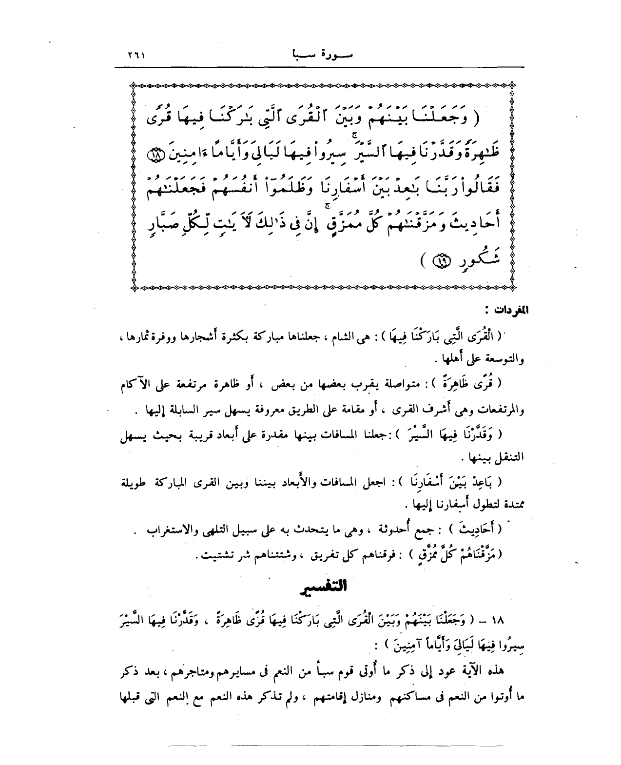 {وَجَعَلْنَا بَيْنَهُمْ وَبَيْنَ الْقُرَى الَّتِي بَارَكْنَا فِيهَا قُرًى ظَاهِرَةً وَقَدَّرْنَا فِيهَا السَّيْرَ سِيرُوا فِيهَا لَيَالِيَ وَأَيَّامًا آمِنِينَ (18) فَقَالُوا رَبَّنَا بَاعِدْ بَيْنَ أَسْفَارِنَا وَظَلَمُوا أَنْفُسَهُمْ فَجَعَلْنَاهُمْ أَحَادِيثَ وَمَزَّقْنَاهُمْ كُلَّ مُمَزَّقٍ إِنَّ فِي ذَلِكَ لَآيَاتٍ لِكُلِّ صَبَّارٍ شَكُورٍ (19)}