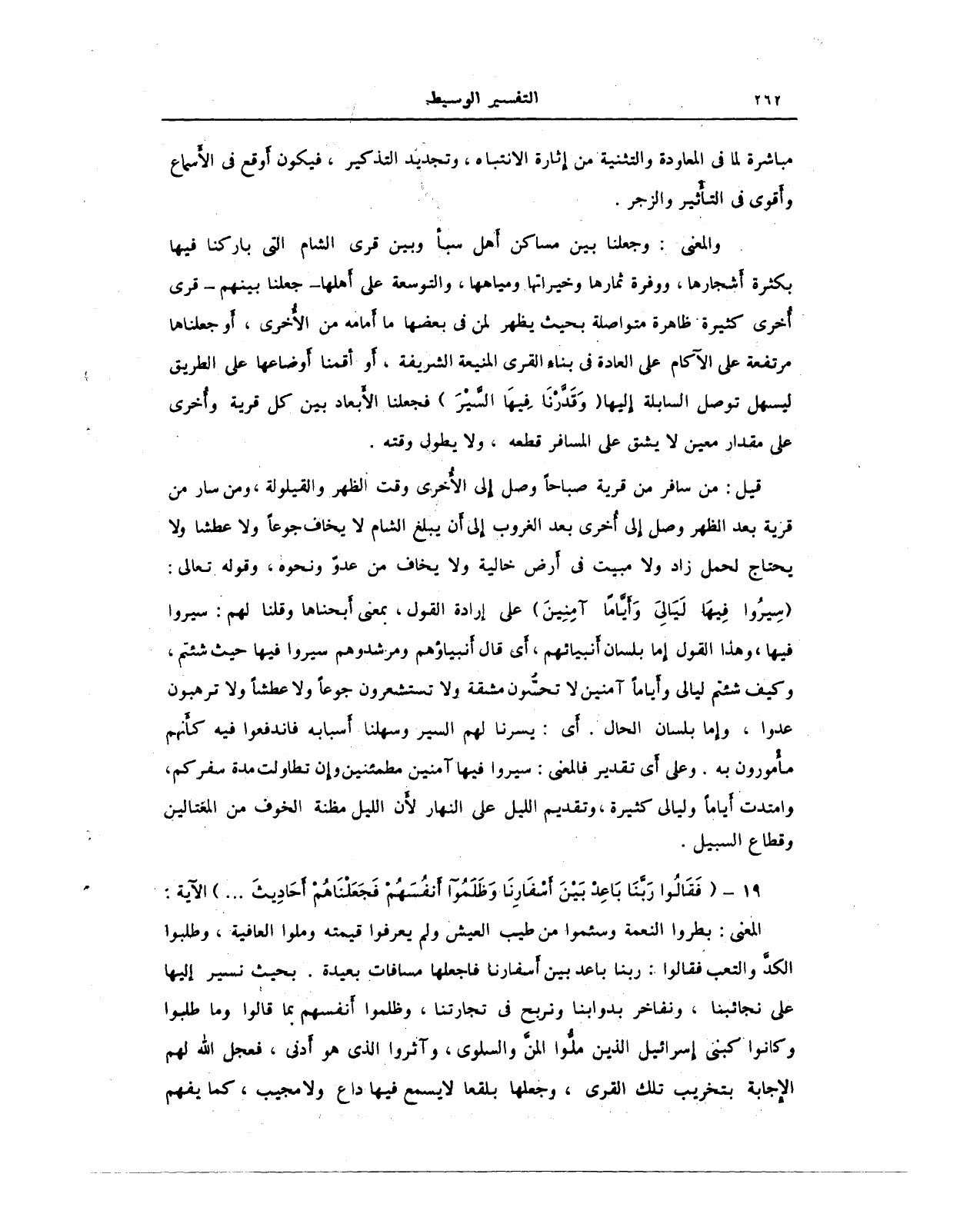 والمعنى: وجعلنا بين مساكن أهل سبأ وبين قرى الشام التي باركنا فيها بكثرة أشجارها، ووفرة ثمارها وخيراتها - ومياهها، والتوسعة على أهلها - جعلنا بينهم - قرى أخرى كثيرة ظاهرة متواصلة بحيث يظهر لمن في بعضها ما أمامه من الأُخرى، أو جعلناها مرتفعة على الآكام على العادة في بناه القرى المنيعة الشريفة، أو أقمنا أوضاعها على الطريق ليسهل توصل السابلة إليها {وَقَدَّرْنَا فِيهَا السَّيْرَ} فجعلنا الأبعاد بين كل قرية وأخرى على مقدار معين لا يشق على المسافر قطعه، ولا يطول وقته.