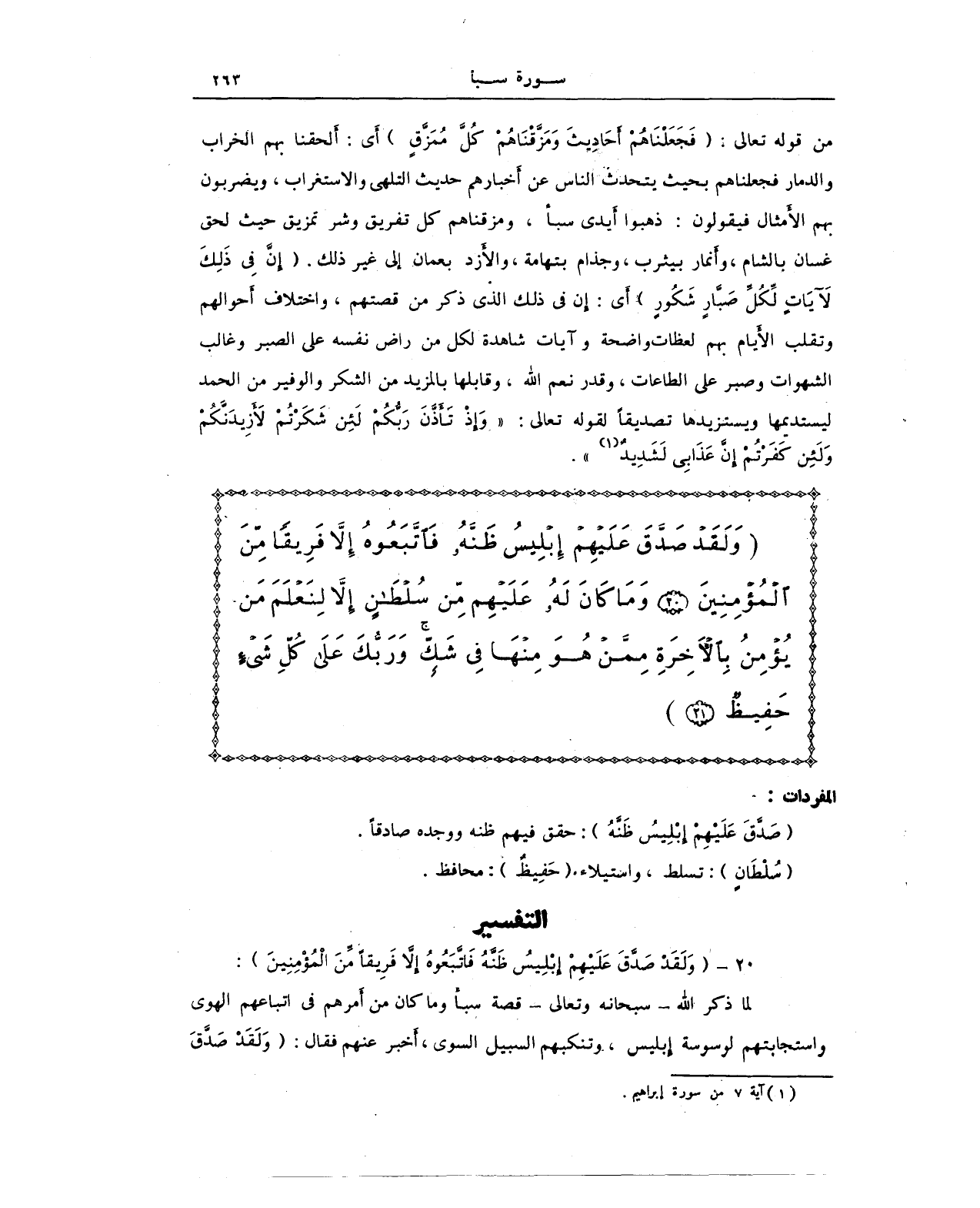 {وَلَقَدْ صَدَّقَ عَلَيْهِمْ إِبْلِيسُ ظَنَّهُ فَاتَّبَعُوهُ إِلَّا فَرِيقًا مِنَ الْمُؤْمِنِينَ (20) وَمَا كَانَ لَهُ عَلَيْهِمْ مِنْ سُلْطَانٍ إِلَّا لِنَعْلَمَ مَنْ يُؤْمِنُ بِالْآخِرَةِ مِمَّنْ هُوَ مِنْهَا فِي شَكٍّ وَرَبُّكَ عَلَى كُلِّ شَيْءٍ حَفِيظٌ}