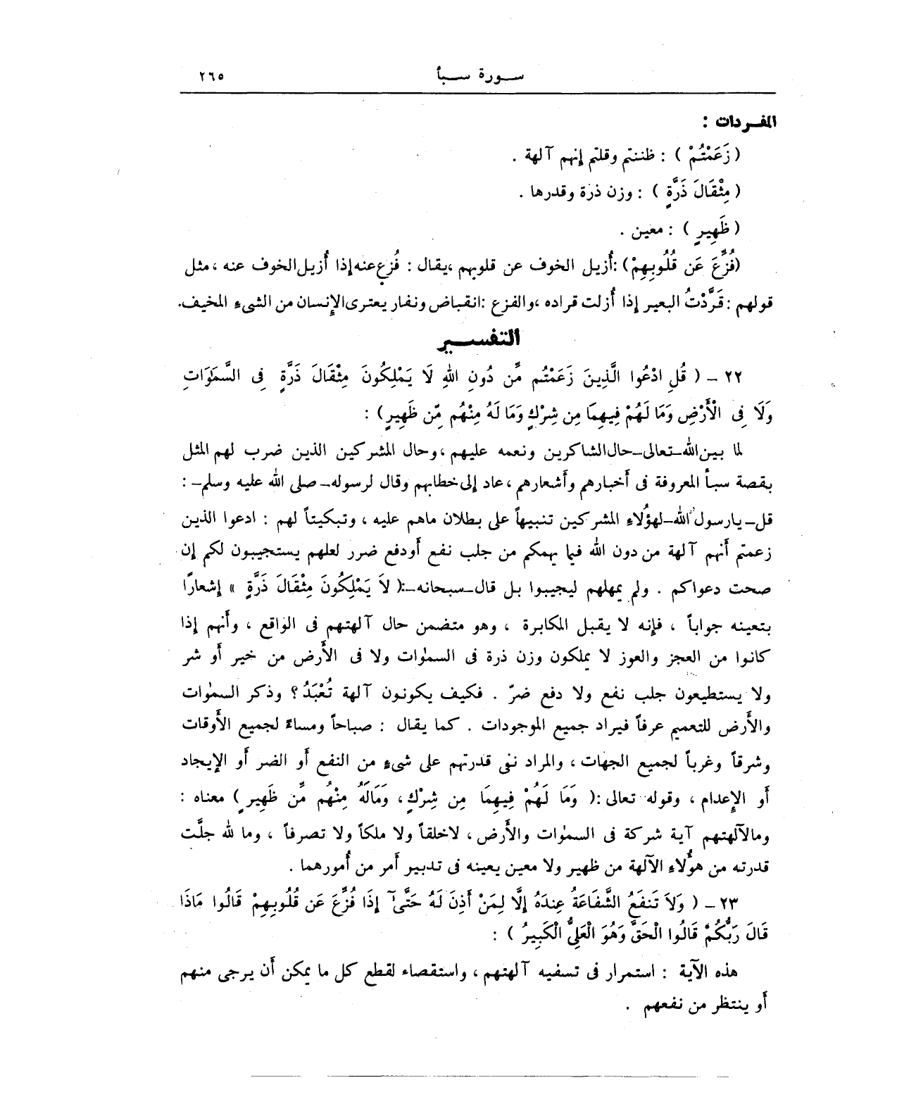 لما بين الله - تعالى - حال الشاكرين ونعمه عليهم، وحال المشركين الذين ضرب لهم المثل بقصة سبأ المعروفة في أخبارهم وأشعارهم، عاد إلى خطابهم وقال لرسوله - صلى الله عليه وسلم -: قل - يا رسول الله - لهولاء المشركين تنبيهًا على بطلان ما هم عليه، وتبكيتًا لهم: ادعوا الذين زعمتم أنهم آلهة من دون الله فيما يهمكم من جب نفع أو دفع ضرر لعلهم يستجيبون لكم إن صحت دعواكم. ولم يمهلهم ليجيبوا بل قال - سبحانه - {لَا يَمْلِكُونَ مِثْقَالَ ذَرَّة} إشعارًا بتعينه جوابًا، فإنه لا يقبل المكابرة، وهو متضمن حال آلهتهم في الواقع، وأنهم إذا كانوا من العجز والعوز لا يملكون وزن ذرة في السموات ولا في الأرض من خير أو شر ولا يستطيعون جلب نفع ولا دفع ضرّ. فكيف يكونون آلهة تُعْبدُ؟ وذكر السموات والأرض للتعميم عرفًا فيراد جميع الموجودات. كما يقال: صباحًا ومساءً لجميع الأوقات وشرقًا وغربًا لجميع الجهات، والمراد نفى قدرتهم على شيء من النفع أو الضر أو الإيجاد أو الإعدام، وقوله - تعالى: {وَمَا لَهُمْ فِيهِمَا مِنْ شِرْكٍ وَمَا لَهُ مِنْهُمْ مِنْ ظَهِير} معناه: ومالآلهتهم آية شركة في السموات والأرض، لا خلقًا ولا ملكًا ولا تصرفًا، وما لله جلَّت قدرته من هؤلاء الآلهة من ظهير ولا معين يعينه في تدبير أمر من أمورهما.