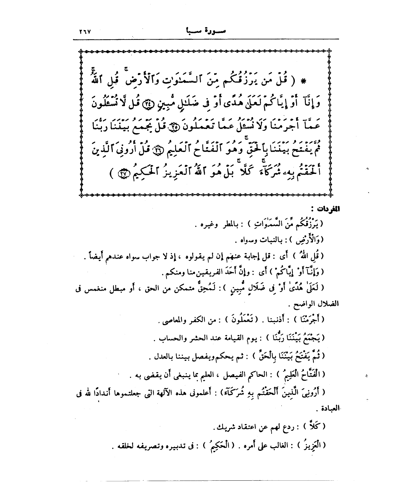 {قُلْ مَنْ يَرْزُقُكُمْ مِنَ السَّمَاوَاتِ وَالْأَرْضِ قُلِ اللَّهُ وَإِنَّا أَوْ إِيَّاكُمْ لَعَلَى هُدًى أَوْ فِي ضَلَالٍ مُبِينٍ (24) قُلْ لَا تُسْأَلُونَ عَمَّا أَجْرَمْنَا وَلَا نُسْأَلُ عَمَّا تَعْمَلُونَ (25) قُلْ يَجْمَعُ بَيْنَنَا رَبُّنَا ثُمَّ يَفْتَحُ بَيْنَنَا بِالْحَقِّ وَهُوَ الْفَتَّاحُ الْعَلِيمُ (26) قُلْ أَرُونِيَ الَّذِينَ أَلْحَقْتُمْ بِهِ شُرَكَاءَ كَلَّا بَلْ هُوَ اللَّهُ الْعَزِيزُ الْحَكِيمُ (27)} المفردات: