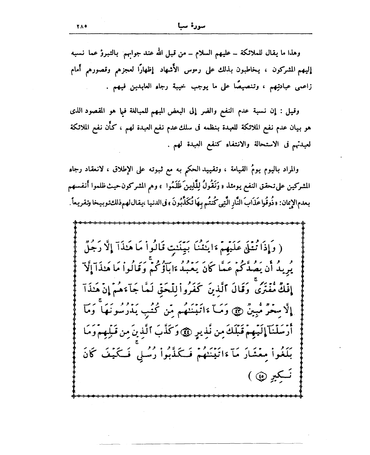 {وَإِذَا تُتْلَى عَلَيْهِمْ آيَاتُنَا بَيِّنَاتٍ قَالُوا مَا هَذَا إِلَّا رَجُلٌ يُرِيدُ أَنْ يَصُدَّكُمْ عَمَّا كَانَ يَعْبُدُ آبَاؤُكُمْ وَقَالُوا مَا هَذَا إِلَّا إِفْكٌ مُفْتَرًى وَقَالَ الَّذِينَ كَفَرُوا لِلْحَقِّ لَمَّا جَاءَهُمْ إِنْ هَذَا إِلَّا سِحْرٌ مُبِينٌ (43) وَمَا آتَيْنَاهُمْ مِنْ كُتُبٍ يَدْرُسُونَهَا وَمَا أَرْسَلْنَا إِلَيْهِمْ قَبْلَكَ مِنْ نَذِيرٍ (44) وَكَذَّبَ الَّذِينَ مِنْ قَبْلِهِمْ وَمَا بَلَغُوا مِعْشَارَ مَا آتَيْنَاهُمْ فَكَذَّبُوا رُسُلِي فَكَيْفَ كَانَ نَكِيرِ}