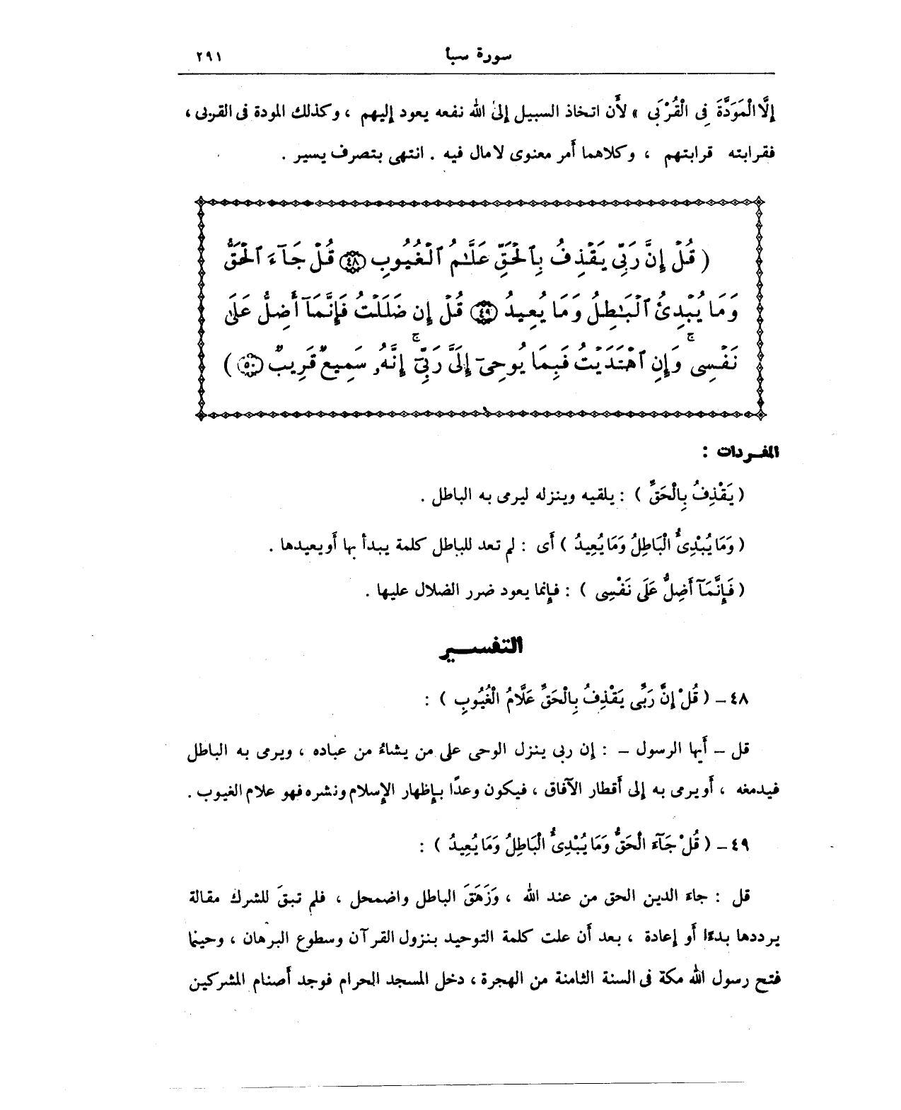 {قُلْ إِنَّ رَبِّي يَقْذِفُ بِالْحَقِّ عَلَّامُ الْغُيُوبِ (48) قُلْ جَاءَ الْحَقُّ وَمَا يُبْدِئُ الْبَاطِلُ وَمَا يُعِيدُ (49) قُلْ إِنْ ضَلَلْتُ فَإِنَّمَا أَضِلُّ عَلَى نَفْسِي وَإِنِ اهْتَدَيْتُ فَبِمَا يُوحِي إِلَيَّ رَبِّي إِنَّهُ سَمِيعٌ قَرِيبٌ}