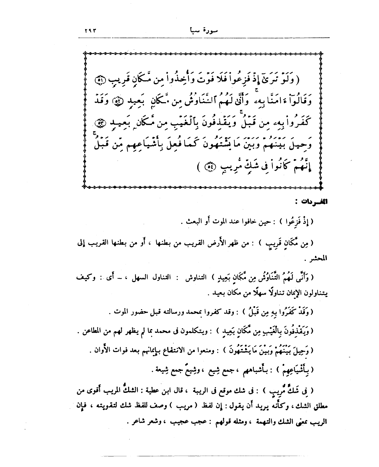 {وَلَوْ تَرَى إِذْ فَزِعُوا فَلَا فَوْتَ وَأُخِذُوا مِنْ مَكَانٍ قَرِيبٍ (51) وَقَالُوا آمَنَّا بِهِ وَأَنَّى لَهُمُ التَّنَاوُشُ مِنْ مَكَانٍ بَعِيدٍ (52) وَقَدْ كَفَرُوا بِهِ مِنْ قَبْلُ وَيَقْذِفُونَ بِالْغَيْبِ مِنْ مَكَانٍ بَعِيدٍ (53) وَحِيلَ بَيْنَهُمْ وَبَيْنَ مَا يَشْتَهُونَ كَمَا فُعِلَ بِأَشْيَاعِهِمْ مِنْ قَبْلُ إِنَّهُمْ كَانُوا فِي شَكٍّ مُرِيبٍ}