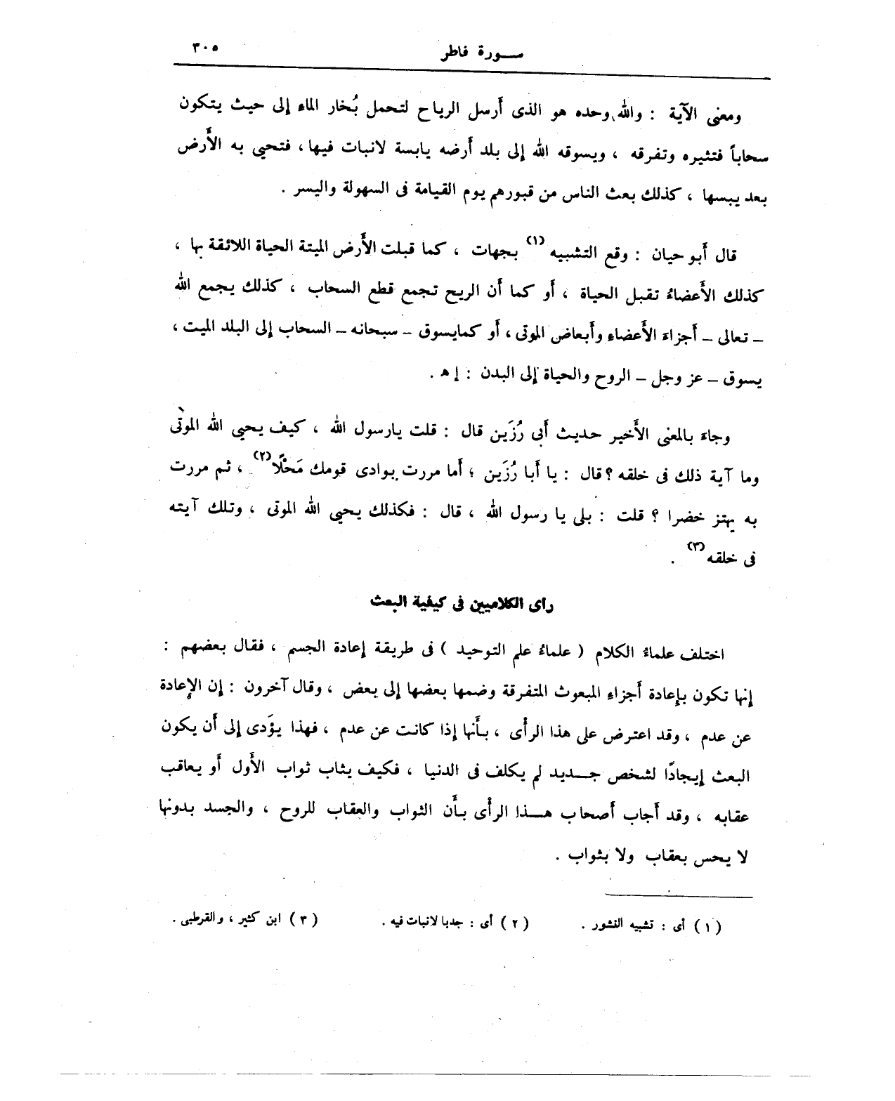 ومعنى الآية: والله وحده هو الذي أرسل الرياح لتحمل بُخار الماء إلى حيث يتكون سحابًا فتثيره وتفرقه، ويسوقه الله إلى بلد أرضه يابسة لا نبات فيها، فتحيى به الأرض بعد يبسها، كذلك بعث الناس من قبورهم يوم القيامة في السهولة واليسر.