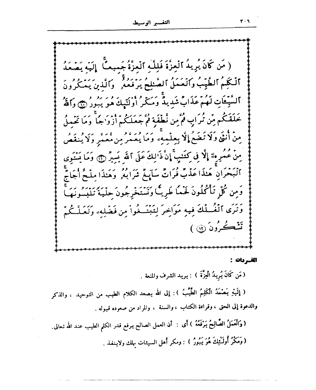 {مَنْ كَانَ يُرِيدُ الْعِزَّةَ فَلِلَّهِ الْعِزَّةُ جَمِيعًا إِلَيْهِ يَصْعَدُ الْكَلِمُ الطَّيِّبُ وَالْعَمَلُ الصَّالِحُ يَرْفَعُهُ وَالَّذِينَ يَمْكُرُونَ السَّيِّئَاتِ لَهُمْ عَذَابٌ شَدِيدٌ وَمَكْرُ أُولَئِكَ هُوَ يَبُورُ (10) وَاللَّهُ خَلَقَكُمْ مِنْ تُرَابٍ ثُمَّ مِنْ نُطْفَةٍ ثُمَّ جَعَلَكُمْ أَزْوَاجًا وَمَا تَحْمِلُ مِنْ أُنْثَى وَلَا تَضَعُ إِلَّا بِعِلْمِهِ وَمَا يُعَمَّرُ مِنْ مُعَمَّرٍ وَلَا يُنْقَصُ مِنْ عُمُرِهِ إِلَّا فِي كِتَابٍ إِنَّ ذَلِكَ عَلَى اللَّهِ يَسِيرٌ (11) وَمَا يَسْتَوِي الْبَحْرَانِ هَذَا عَذْبٌ فُرَاتٌ سَائِغٌ شَرَابُهُ وَهَذَا مِلْحٌ أُجَاجٌ وَمِنْ كُلٍّ تَأْكُلُونَ لَحْمًا طَرِيًّا وَتَسْتَخْرِجُونَ حِلْيَةً تَلْبَسُونَهَا وَتَرَى الْفُلْكَ فِيهِ مَوَاخِرَ لِتَبْتَغُوا مِنْ فَضْلِهِ وَلَعَلَّكُمْ تَشْكُرُونَ}