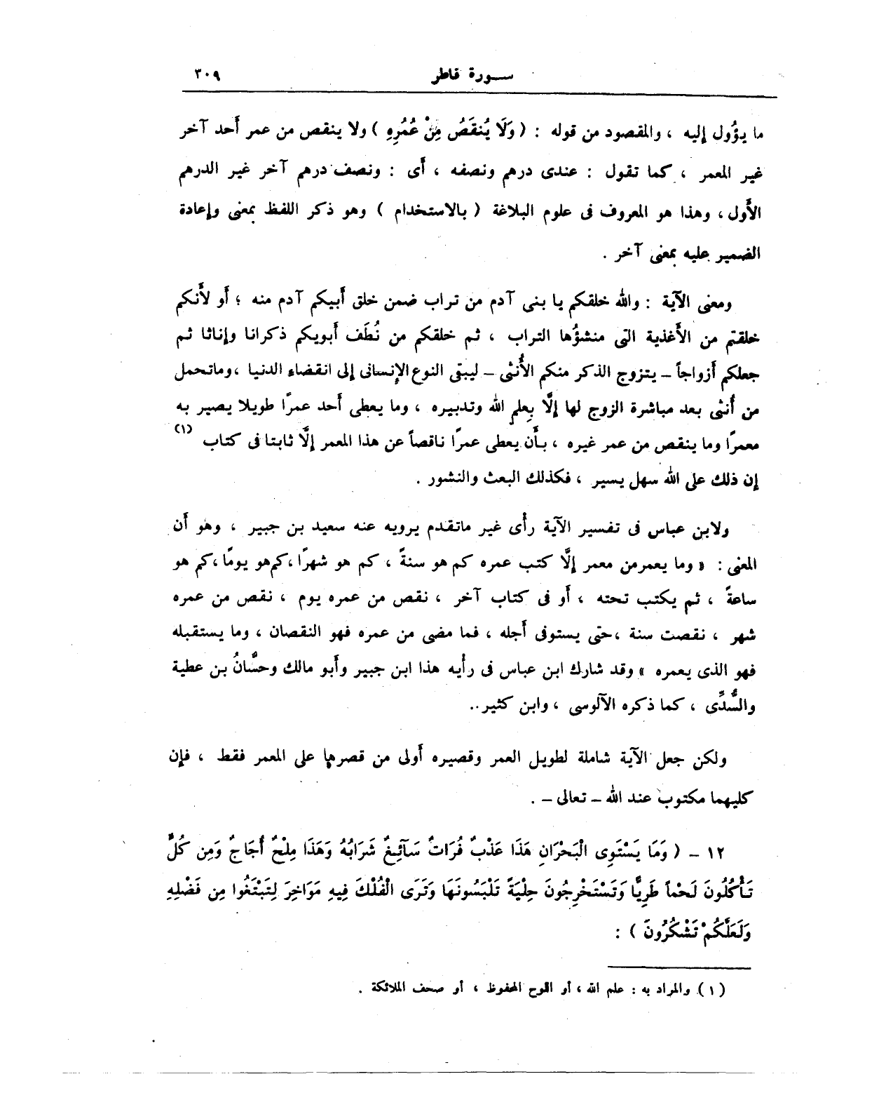 ما يؤول إليه، والمقصود من قوله: {وَلَا يُنْقَصُ مِنْ عُمُرِهِ} ولا ينقص من عمر أحد آخر غير المعمر، كما تقول: عندي درهم ونصفه، أي: ونصف درهم آخر غير الدرهم الأول، وهذا هو المعروف في علوم البلاغة (بالاستخدام) وهو ذكر اللفظ بمعنى وإعادة الضمير عليه بمعنى آخر.