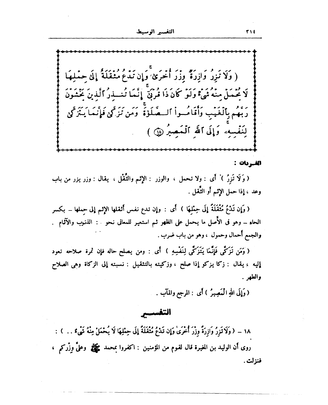 {وَلَا تَزِرُ وَازِرَةٌ وِزْرَ أُخْرَى وَإِنْ تَدْعُ مُثْقَلَةٌ إِلَى حِمْلِهَا لَا يُحْمَلْ مِنْهُ شَيْءٌ وَلَوْ كَانَ ذَا قُرْبَى إِنَّمَا تُنْذِرُ الَّذِينَ يَخْشَوْنَ رَبَّهُمْ بِالْغَيْبِ وَأَقَامُوا الصَّلَاةَ وَمَنْ تَزَكَّى فَإِنَّمَا يَتَزَكَّى لِنَفْسِهِ وَإِلَى اللَّهِ الْمَصِيرُ}