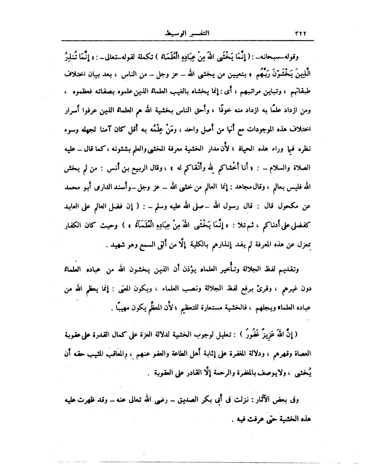 وقوله - سبحانه -: {إِنَّمَا يَخْشَى اللَّهَ مِنْ عِبَادِهِ الْعُلَمَاءُ} تكملة لقوله - تعالى -: {إِنَّمَا تُنْذِرُ الَّذِينَ يَخْشَوْنَ رَبَّهُمْ} بتعيين من يخشى الله - عَزَّ وَجَلَّ - من الناس، بعد بيان اختلاف طبقاتهم، وتباين مراتبهم، أي: إنما يخشاه بالغيب العلماءُ الذين علموه بصفاته فعظموه، ومن ازداد علمًا به ازداد منه خوفًا، وأَحق الناس بخشية الله هم العلماءُ الذين عرفوا أسرار اختلاف هذه الموجودات مع أَنها من أَصل واحد، ومَنْ عِلْمُه به أَقل كان آمنا لجهله وسوء نظره فيما وراء هذه الحياة؛ لأَن مدار الخشية معرفة المخشى والعلم بشئونه، كما قال - عليه الصلاة والسلام -: "أنا أخشاكم لله وأَتْقاكم له"، وقال الربيع بن أَنس: من لم يخش الله فليس بعالم، وقال مجاهد: إنما العالم من خشى الله - عَزَّ وَجَلَّ - وأسند الدارمى أبو محمد عن مكحول قال: قال رسول الله - صلى الله عليه وسلم -: (إن فضل العالم على العابد كفضلي على أدناكم، ثم تلا: {إِنَّمَا يَخْشَى اللَّهَ مِنْ عِبَادِهِ الْعُلَمَاءُ}) وحيث كان الكفار بمعزل عن هذه المعرفة لم يفد إنذارهم بالكلية إلاَّ من ألقى السمع وهو شهيد.