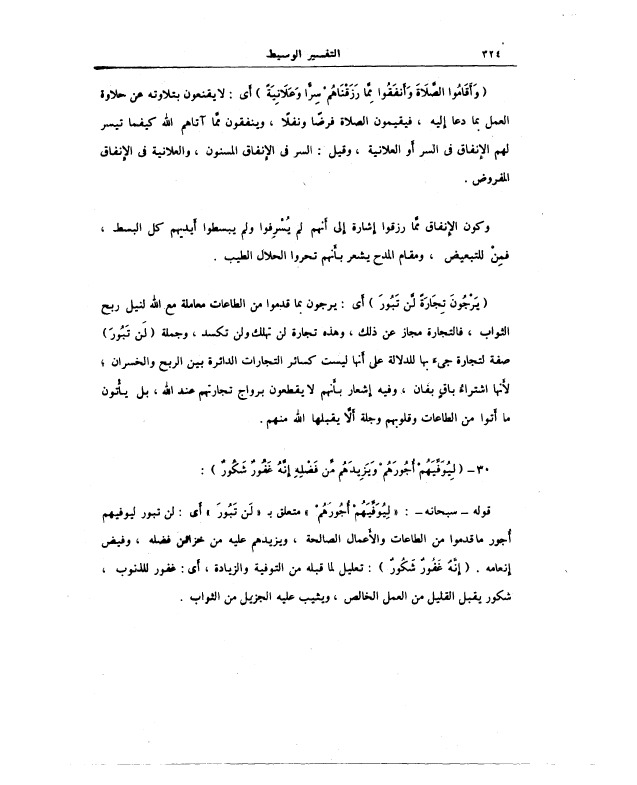 قوله - سبحانه -: {لِيُوَفِّيَهُمْ أُجُورَهُمْ} متعلق بـ {لَنْ تَبُورَ} أَي: لن تبور ليوفيهم أُجور ما قدموا من الطاعات والأعمال الصالحة، ويزيدهم عليه من خزائن فضله، وفيض إنعامه. {إِنَّهُ غَفُورٌ شَكُورٌ}: تعليل لما قبله من التوفية والزيادة، أي: غفور للذنوب، شكور يقبل القليل من العمل الخالص، ويثيب عليه الجزيل من الثواب.