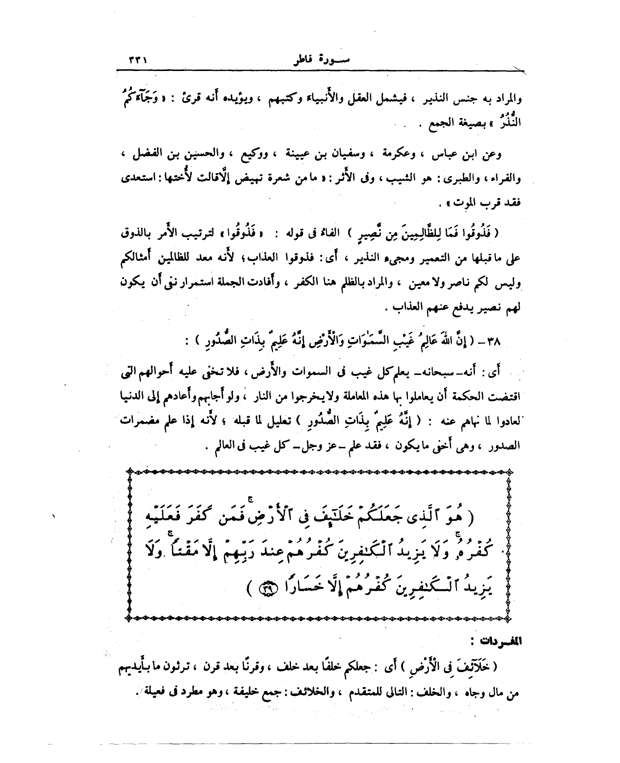 {هُوَ الَّذِي جَعَلَكُمْ خَلَائِفَ فِي الْأَرْضِ فَمَنْ كَفَرَ فَعَلَيْهِ كُفْرُهُ وَلَا يَزِيدُ الْكَافِرِينَ كُفْرُهُمْ عِنْدَ رَبِّهِمْ إِلَّا مَقْتًا وَلَا يَزِيدُ الْكَافِرِينَ كُفْرُهُمْ إِلَّا خَسَارًا (39)}