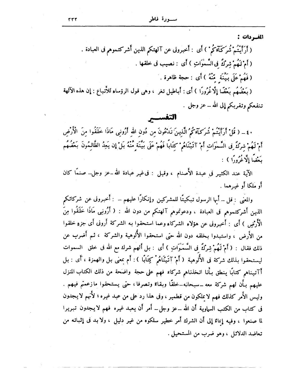 والمعنى: قل - أَيها الرسول تبكيتًا للمشركين وإنكارًا عليهم -: أَخبروني عن شركائكم الذين أَشركتموهم في العبادة، ودعوتموهم آلهتكم من دون الله: {أَرُونِي مَاذَا خَلَقُوا مِنَ الْأَرْضِ} أَي: أَخبرونى عن هؤلاء الشركاء وعما استحقوا به الشركة أَرونى أَي جزءٍ خلقوا من الأَرض، واستبدوا بخلقه دون الله حتى استحقوا الأُلوهية والشركة، ثم أَضرب عن ذلك فقال: {أَمْ لَهُمْ شِرْكٌ فِي السَّمَاوَاتِ} أَي: بل أَلهم شرك مع الله في خلق السموات ليستحقوا بذلك شركة في الأُلوهية {أَمْ آتَيْنَاهُمْ كِتَابًا}: أَم بمعنى بل والهمزة، أَي: بل أآتيناهم كتابًا ينطق بأَنا اتخذناهم شركاءَ فهم على حجة واضحة من ذلك الكتاب المنزل عليهم بأن لهم شركة معه - سبحانه - خلقًا وبقاءً وتصرفا، حتى يستحقوا ما زعمتم فيهم. وليس الأَمر كذلك فهم لا يملكون من قطمير، وفي هذا رد على من عبد غيره؛ لأَنهم لا يجدون في كتاب من الكتب السماوية أَن الله - عَزَّ وَجَلَّ - أمر أَن يعبد غيره فهم لا يجدون تبريرا لما صنعوا، وفيه إيماءٌ إِلى أَن الشرك أَمر خطير سلكوه من غير دليل، ولا بد في إِثباته من تعاضد الدلائل، وهو ضرب من المستحيل.