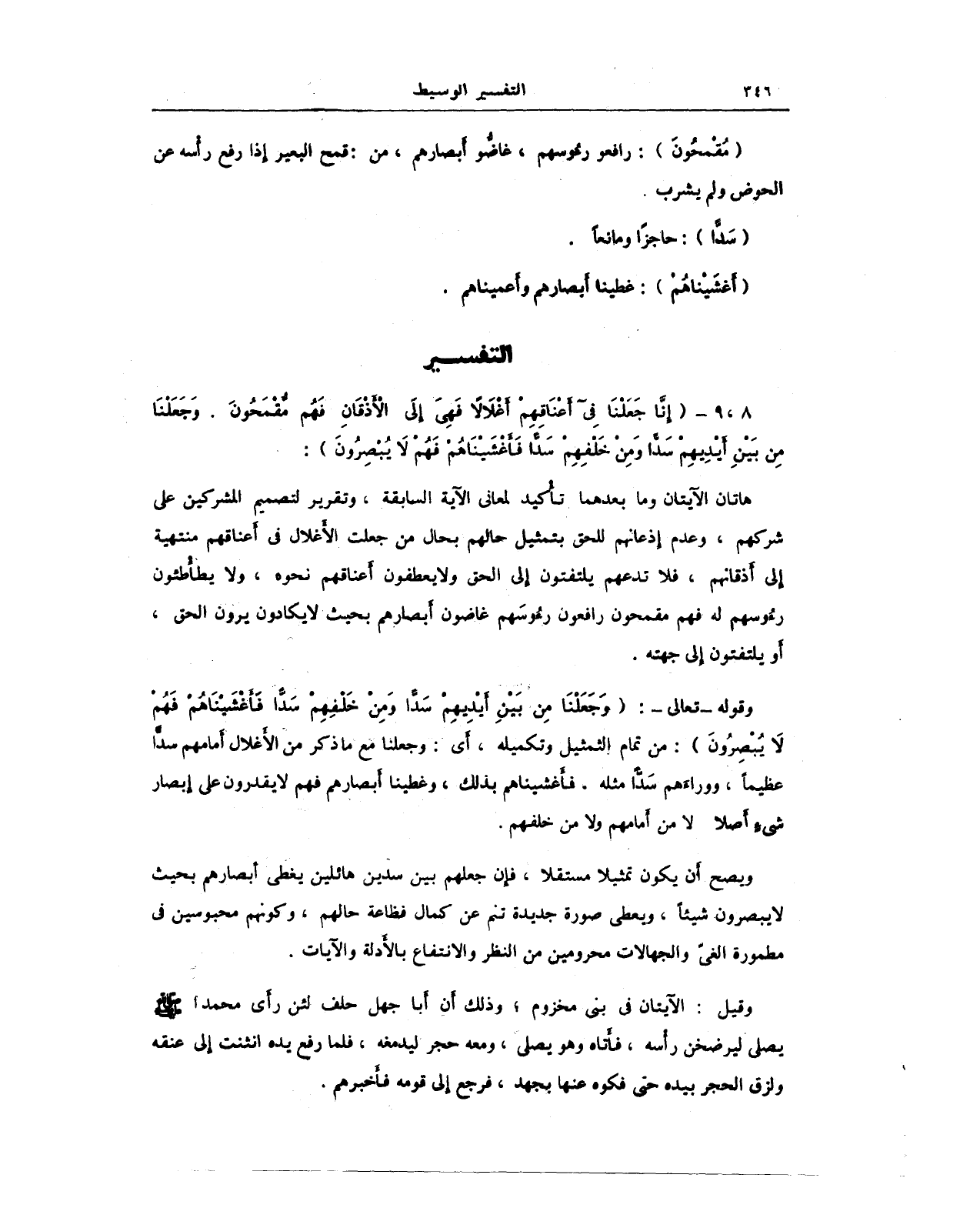 هاتان الآيتان وما بعدهما تأكيد لمعاني الآية السابقة، وتقرير لتصميم المشركين على شركهم، وعدم إذعانهم للحق بتمثيل حالهم بحال من جعلت الأَغلال في أَعناقهم منتهية إِلى أَذقانهم، فلا تدعهم يلتفتون إلى الحق ولا يعطفون أَعناقهم نحوه، ولا يطأْطئون رءُوسهم له فهم مقمحون رافعون رءُوسَهم غاضون أبصارهم بحيث لا يكادون يرون الحق، أو يلتفتون إلى جهته.