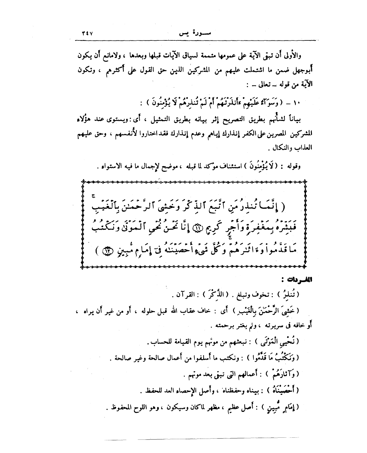 {إِنَّمَا تُنْذِرُ مَنِ اتَّبَعَ الذِّكْرَ وَخَشِيَ الرَّحْمَنَ بِالْغَيْبِ فَبَشِّرْهُ بِمَغْفِرَةٍ وَأَجْرٍ كَرِيمٍ (11) إِنَّا نَحْنُ نُحْيِ الْمَوْتَى وَنَكْتُبُ مَا قَدَّمُوا وَآثَارَهُمْ وَكُلَّ شَيْءٍ أَحْصَيْنَاهُ فِي إِمَامٍ مُبِينٍ (12)}