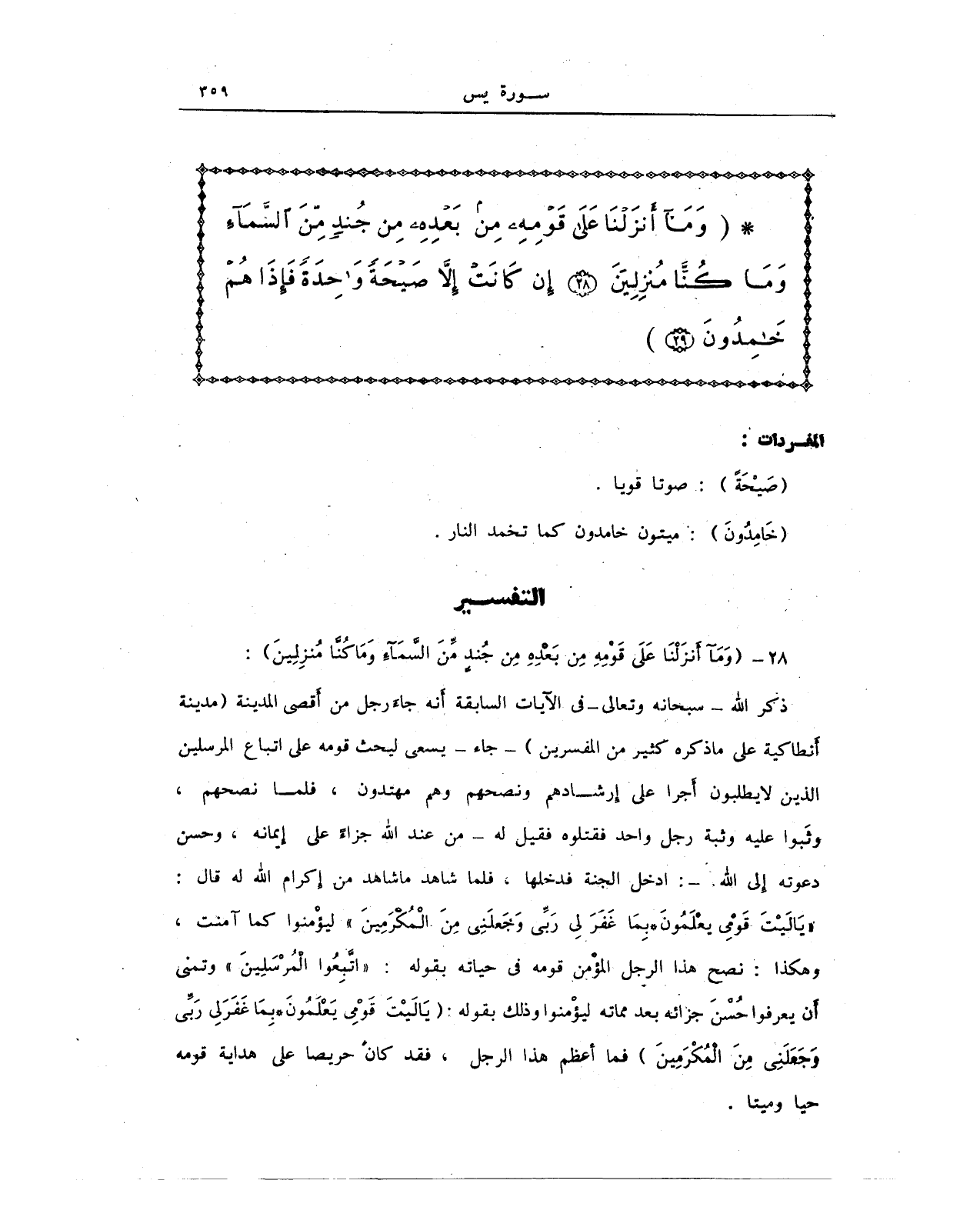 * {وَمَا أَنْزَلْنَا عَلَى قَوْمِهِ مِنْ بَعْدِهِ مِنْ جُنْدٍ مِنَ السَّمَاءِ وَمَا كُنَّا مُنْزِلِينَ (28) إِنْ كَانَتْ إِلَّا صَيْحَةً وَاحِدَةً فَإِذَا هُمْ خَامِدُونَ (29)}