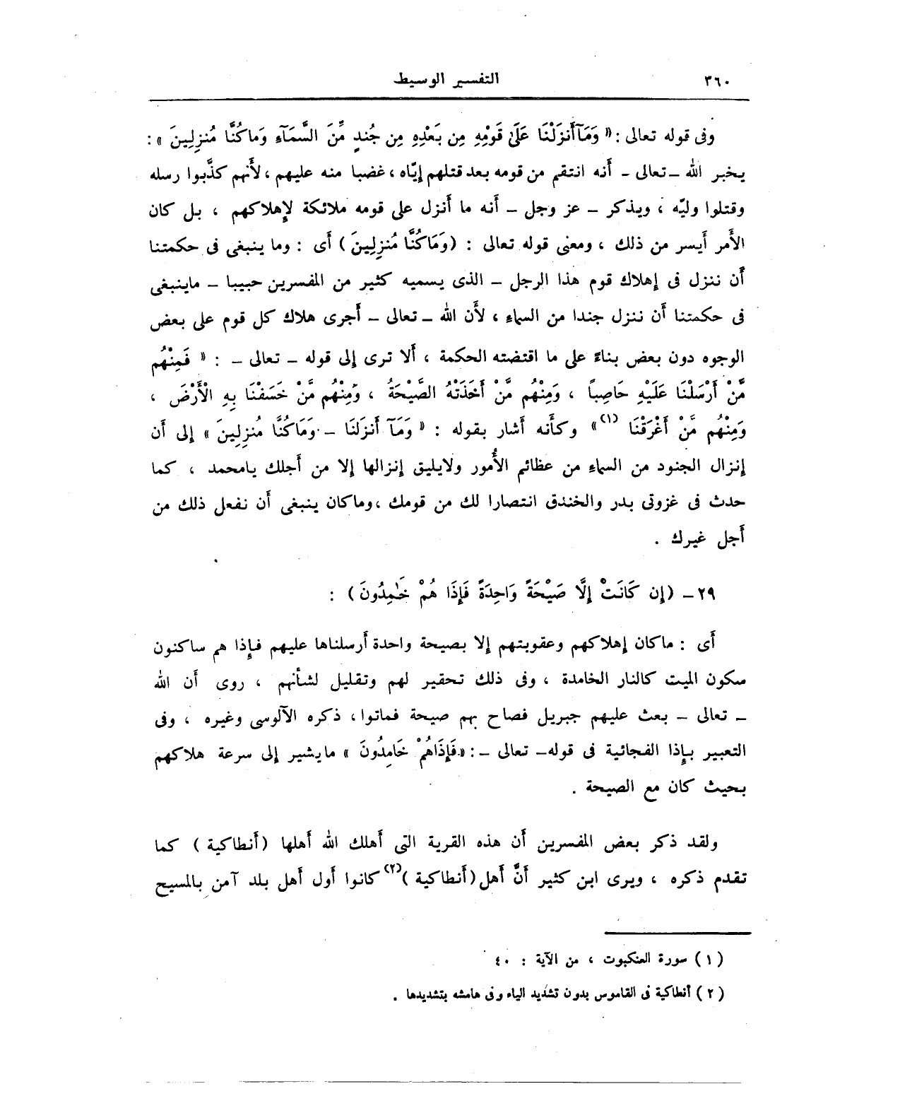 وفي قوله تعالى: {وَمَا أَنْزَلْنَا عَلَى قَوْمِهِ مِنْ بَعْدِهِ مِنْ جُنْدٍ مِنَ السَّمَاءِ وَمَا كُنَّا مُنْزِلِينَ}: يخبر الله - تعالى - أَنه انتقم من قومه بعد قتلهم إيّاه، غضبا منه عليهم، لأَنهم كذبوا رسله وقتلوا وليّه، ويذكر - عَزَّ وَجَلَّ - أَنه ما أَنزل على قومه ملائكة لإهلاكهم، بل كان الأمر أيسر من ذلك، ومعنى قوله تعالى: {وَمَا كُنَّا مُنْزِلِينَ} أَي: وما ينبغي في حكمتنا أَن ننزل في إهلاك قوم هذا الرجل - الذي يسميه كثير من المفسرين حبيبا - ما ينبغي في حكمتنا أَن ننزل جندا من السماء؛ لأَن الله - تعالى - أَجرى هلاك كل قوم على بعض الوجوه دون بعض بناءً على ما اقتضته الحكمة، ألا ترى إِلى قوله - تعالى -: {فَمِنْهُمْ مَنْ أَرْسَلْنَا عَلَيْهِ حَاصِبًا وَمِنْهُمْ مَنْ أَخَذَتْهُ الصَّيْحَةُ وَمِنْهُمْ مَنْ خَسَفْنَا بِهِ الْأَرْضَ وَمِنْهُمْ مَنْ أَغْرَقْنَا} (¬1) وكأنه أَشار بقوله: {وَمَا أَنْزَلْنَا}. {وَمَا كُنَّا مُنْزِلِينَ} إِلى أَن إنزال الجنود من السماء من عظائم الأُمور ولا يليق إِنزالها إلا من أَجلك يا محمد، كما حدث في غزوتي بدر والخندق انتصارا لك من قومك، وما كان ينبغي أَن نفعل ذلك من أجل غيرك.