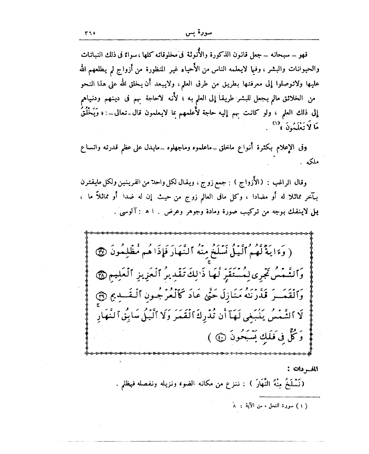 {وَآيَةٌ لَهُمُ اللَّيْلُ نَسْلَخُ مِنْهُ النَّهَارَ فَإِذَا هُمْ مُظْلِمُونَ (37) وَالشَّمْسُ تَجْرِي لِمُسْتَقَرٍّ لَهَا ذَلِكَ تَقْدِيرُ الْعَزِيزِ الْعَلِيمِ (38) وَالْقَمَرَ قَدَّرْنَاهُ مَنَازِلَ حَتَّى عَادَ كَالْعُرْجُونِ الْقَدِيمِ (39) لَا الشَّمْسُ يَنْبَغِي لَهَا أَنْ تُدْرِكَ الْقَمَرَ وَلَا اللَّيْلُ سَابِقُ النَّهَارِ وَكُلٌّ فِي فَلَكٍ يَسْبَحُونَ (40)}
