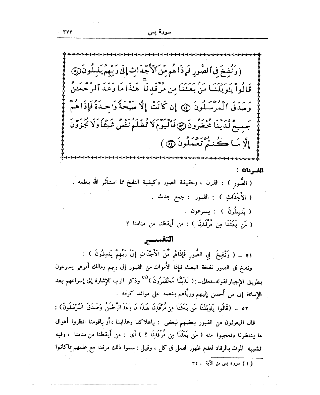 {وَنُفِخَ فِي الصُّورِ فَإِذَا هُمْ مِنَ الْأَجْدَاثِ إِلَى رَبِّهِمْ يَنْسِلُونَ (51) قَالُوا يَا وَيْلَنَا مَنْ بَعَثَنَا مِنْ مَرْقَدِنَا هَذَا مَا وَعَدَ الرَّحْمَنُ وَصَدَقَ الْمُرْسَلُونَ (52) إِنْ كَانَتْ إِلَّا صَيْحَةً وَاحِدَةً فَإِذَا هُمْ جَمِيعٌ لَدَيْنَا مُحْضَرُونَ (53) فَالْيَوْمَ لَا تُظْلَمُ نَفْسٌ شَيْئًا وَلَا تُجْزَوْنَ إِلَّا مَا كُنْتُمْ تَعْمَلُونَ (54)}