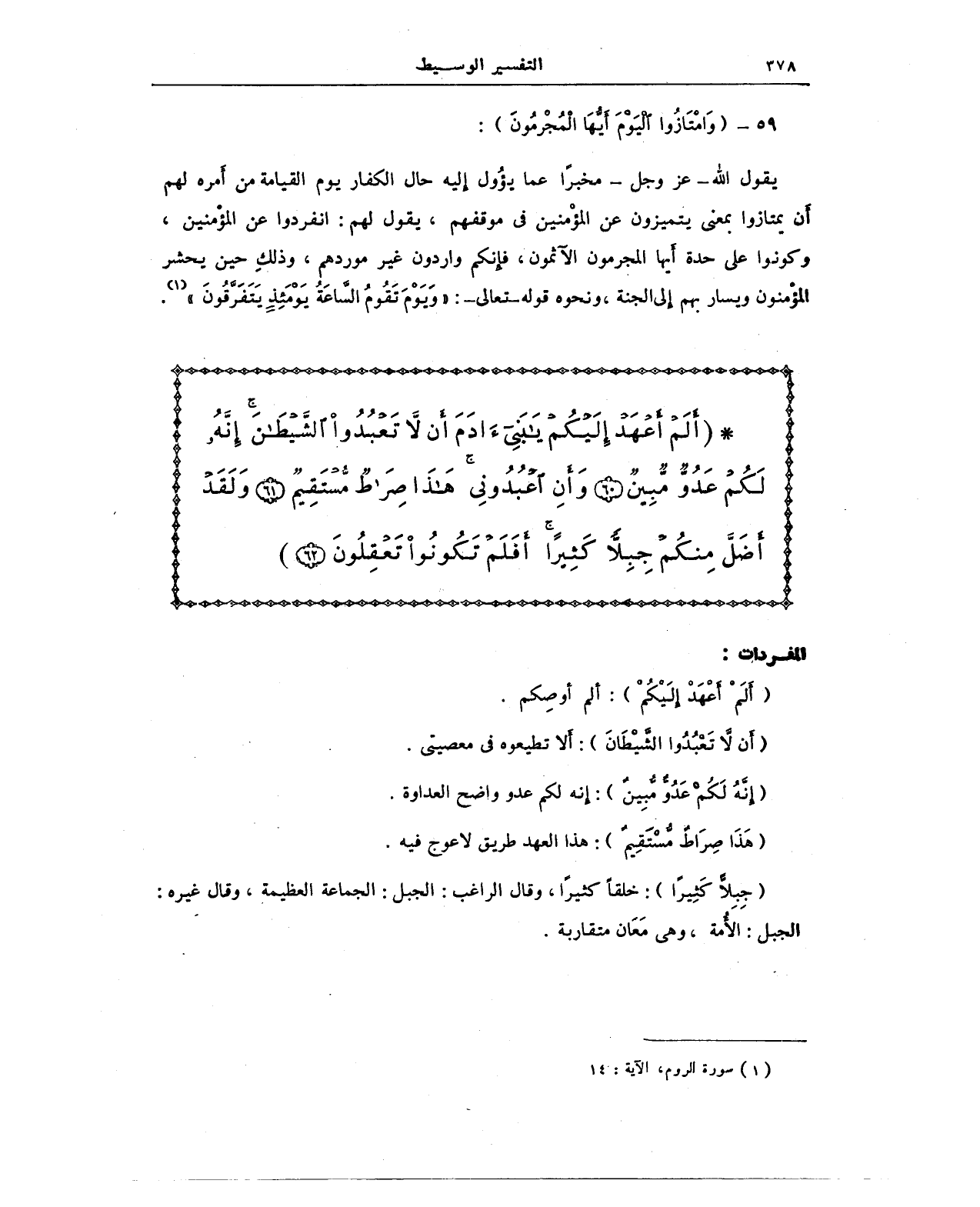 * {أَلَمْ أَعْهَدْ إِلَيْكُمْ يَا بَنِي آدَمَ أَنْ لَا تَعْبُدُوا الشَّيْطَانَ إِنَّهُ لَكُمْ عَدُوٌّ مُبِينٌ (60) وَأَنِ اعْبُدُونِي هَذَا صِرَاطٌ مُسْتَقِيمٌ (61) وَلَقَدْ أَضَلَّ مِنْكُمْ جِبِلًّا كَثِيرًا أَفَلَمْ تَكُونُوا تَعْقِلُونَ (62)}