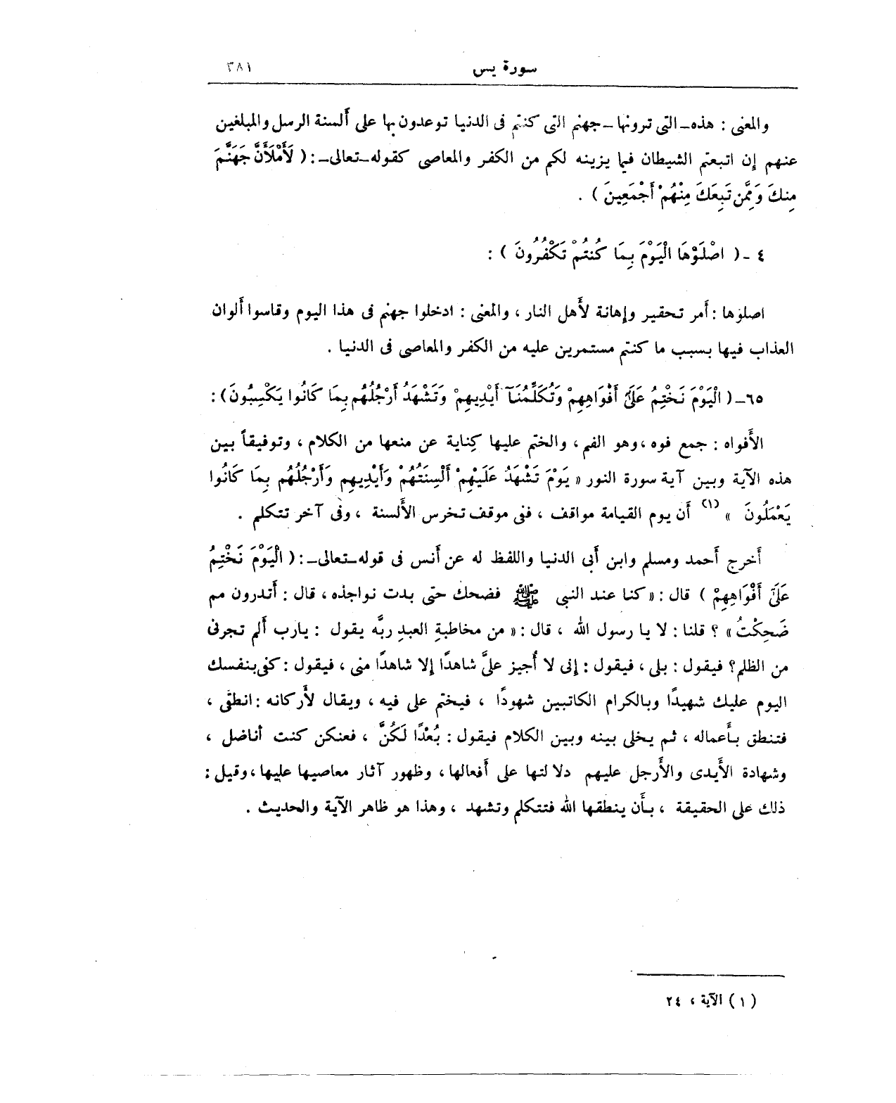 أخرج أحمد ومسلم وابن أبي الدنيا واللفظ له أنس في قوله - تعالى -: {الْيَوْمَ نَخْتِمُ عَلَى أَفْوَاهِهِمْ} قال: "كنا عند النبي - صلى الله عليه وسلم - فضحك حتى بدت نواجذه، قال: أتدرون مم ضَحِكْتُ"؟ قلنا: لا يا رسول الله، قال: "من مخاطبةِ العبدِ ربَّه يقول: يا رب أَلم تجرني من الظلم؟ فيقول: بلى، فيقول: إني لا أُجيز عليَّ شاهدًا إلا شاهدًا مني، فيقول: كفى بنفسك اليوم عليك شهيدًا وبالكرام الكاتبين شهودًا، فيختم على فيه، ويقال لأركانه: انطقي، فتنطق بأعماله، ثم يخلي بينه وبين الكلام فيقول: بُعْدًا لكُنَّ، فعنكن كنت أناضل، وشهادة الأَيدي والأرجل عليهم دلالتها على أفعالها، وظهور آثار معاصيها عليها، وقيل: ذلك على الحقيقة، بأن ينطقها الله فتتكلم وتشهد، وهذا هو ظاهر الآية والحديث.
