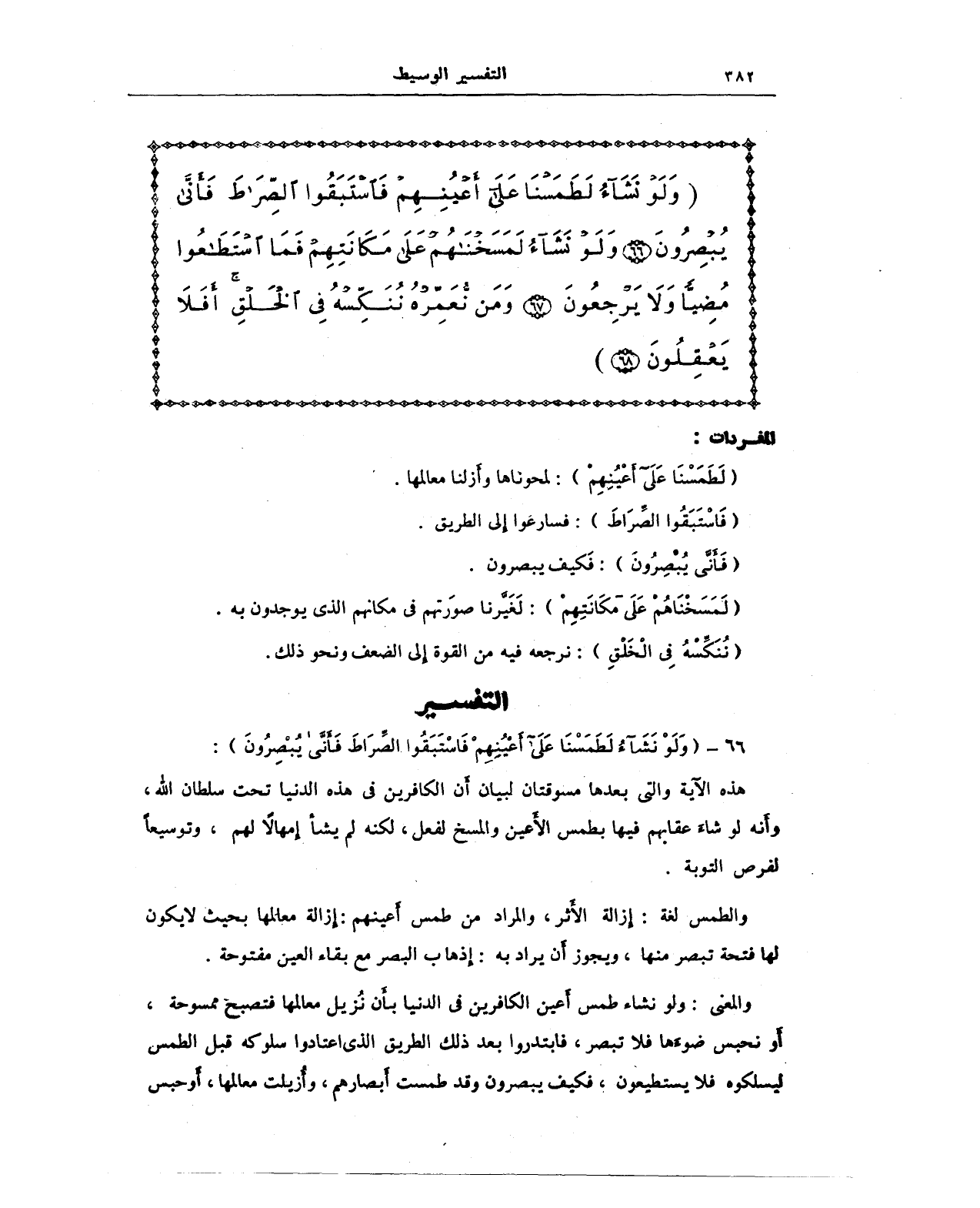 والمعنى: ولو نشاء طمس أَعين الكافرين في الدنيا بأَن نُزيل معالمها فتصبغ ممسوحة، أَو نحبس ضوءَها فلا تبصر، فابتدروا بعد ذلك الطريق الذي اعتادوا سلوكه قبل الطمس ليسلكوه فلا يستطيعون، فكيف يبصرون وقد طمست أَبصارهم، وأزيلت معالمها، أَو حبس