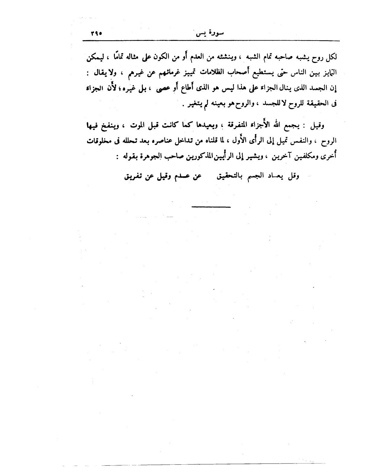 وقيل: يجمع الله الأَجزاء المتفرقة، ويعيدها كما كانت قبل الموت، وينفخ فيها الروح، والنفس تميل إلى الرأْي الأول، لما قلناه من تداخل عناصره بعد تحلله في مخلوقات أخرى ومكلفين آخرين، ويشير إلى الرأيين المذكورين صاحب الجوهرة بقوله: