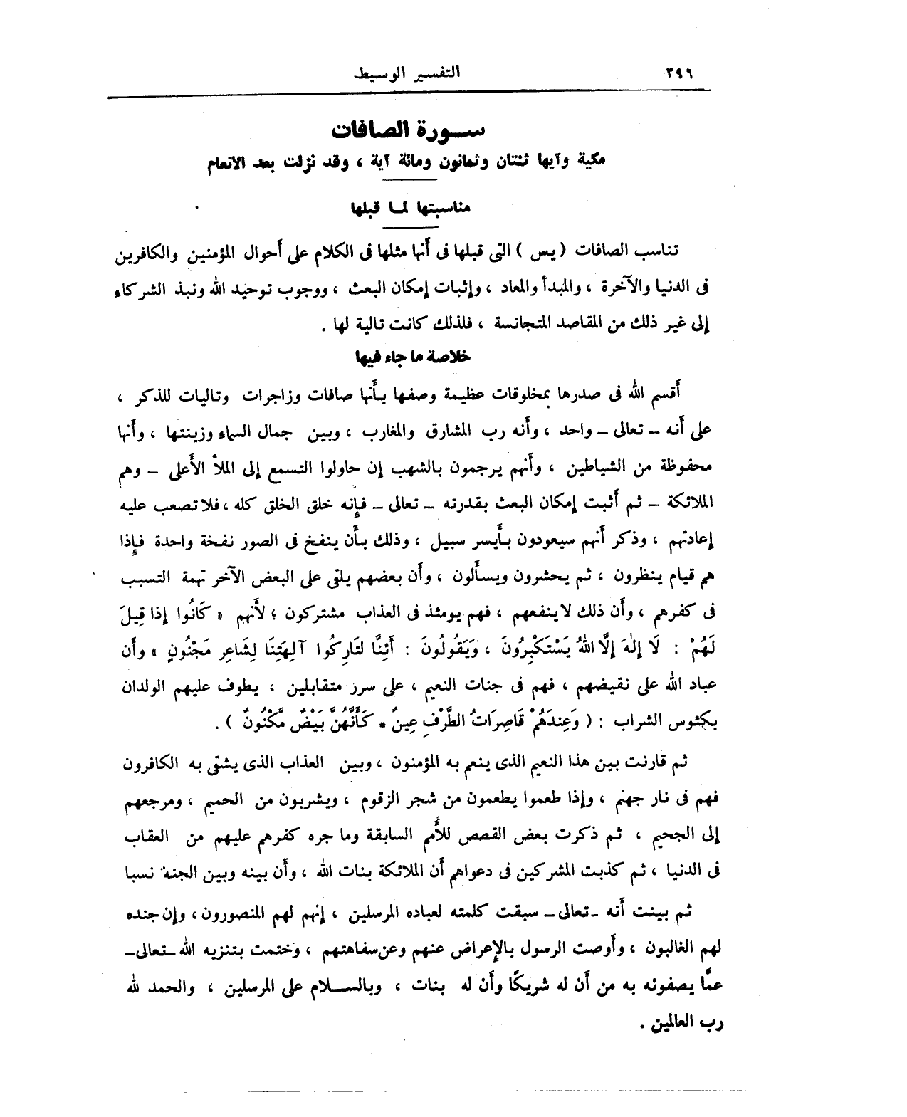 أقسم الله في صدرها بمخلوقات عظيمة وصفها بأَنها صافات وزاجرات وتاليات للذكر، على أنه - تعالى - واحد، وأنه رب المشارق والمغارب، وبين جمال السماء وزينتها، وأنها محفوظة من الشياطين، وأنهم يرجمون بالشهب إن حاولوا التسمع إلى الملأ الأعلى - وهم الملائكة - ثم أثبت إمكان البعث بقدرته - تعالى - فإنه خلق الخلق كله، فلا تصعب عليه إعادتهم، وذكر أنهم سيعودون بأَيسر سبيل، وذلك بأن ينفخ في الصور نفخة واحدة فإذا هم قيام ينظرون، ثم يحشرون ويسأَلون، وأن بعضهم يلقي على البعض الآخر تهمة التسبب في كفرهم، وأَن ذلك لا ينفعهم، فهم يومئذ في العذاب مشتركون؛ لأنهم {كَانُوا إِذَا قِيلَ لَهُمْ لَا إِلَهَ إِلَّا اللَّهُ يَسْتَكْبِرُونَ , وَيَقُولُونَ أَئِنَّا لَتَارِكُوآلِهَتِنَا لِشَاعِرٍ مَجْنُونٍ}: وأن عباد الله على نقيضهم، فهم في جنات النعيم، على سرر متقابلين، يطوف عليهم الولدان بكئوس الشراب: {وَعِنْدَهُمْ قَاصِرَاتُ الطَّرْفِ عِينٌ * كَأَنَّهُنَّ بَيْضٌ مَكْنُونٌ}.