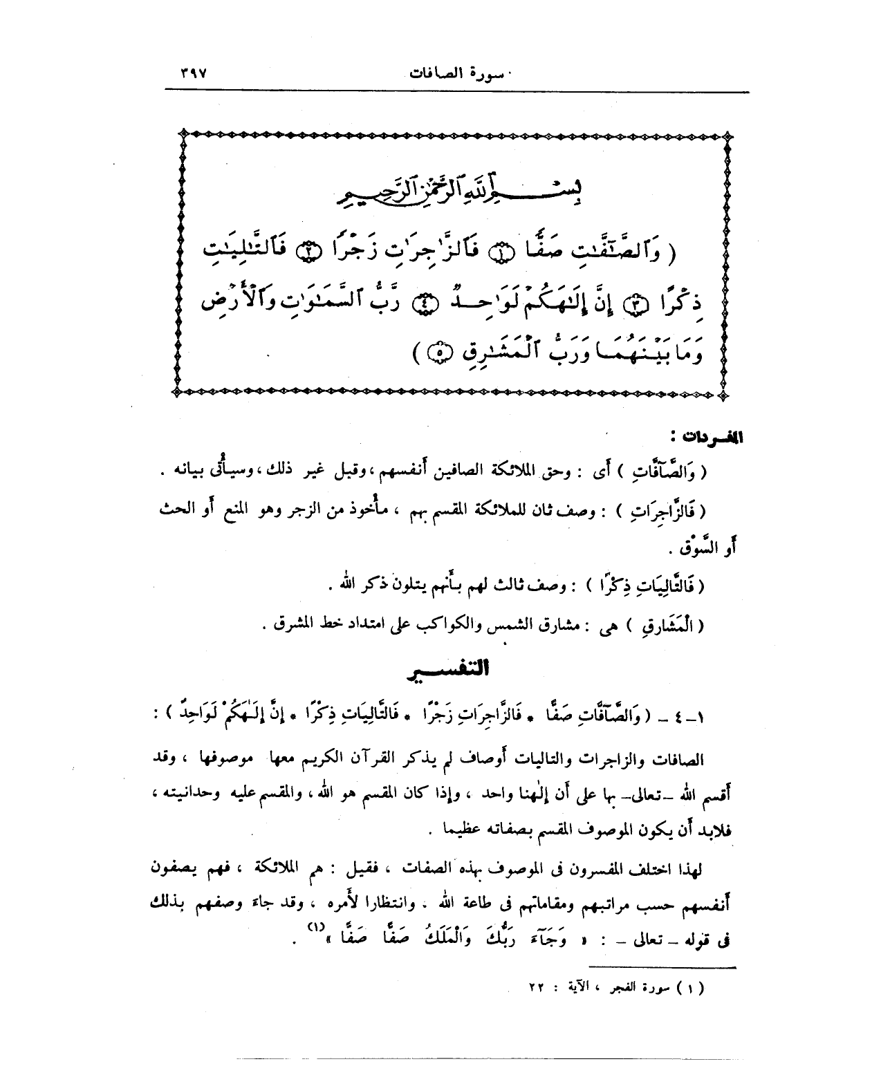 {وَالصَّافَّاتِ صَفًّا (1) فَالزَّاجِرَاتِ زَجْرًا (2) فَالتَّالِيَاتِ ذِكْرًا (3) إِنَّ إِلَهَكُمْ لَوَاحِدٌ (4) رَبُّ السَّمَاوَاتِ وَالْأَرْضِ وَمَا بَيْنَهُمَا وَرَبُّ الْمَشَارِقِ (5)}