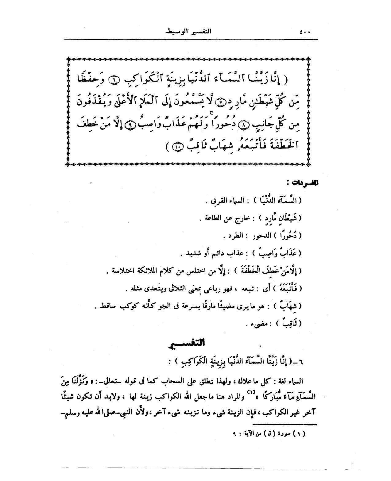 {إِنَّا زَيَّنَّا السَّمَاءَ الدُّنْيَا بِزِينَةٍ الْكَوَاكِبِ (6) وَحِفْظًا مِنْ كُلِّ شَيْطَانٍ مَارِدٍ (7) لَا يَسَّمَّعُونَ إِلَى الْمَلَإِ الْأَعْلَى وَيُقْذَفُونَ مِنْ كُلِّ جَانِبٍ (8) دُحُورًا وَلَهُمْ عَذَابٌ وَاصِبٌ (9) إِلَّا مَنْ خَطِفَ الْخَطْفَةَ فَأَتْبَعَهُ شِهَابٌ ثَاقِبٌ (10)}