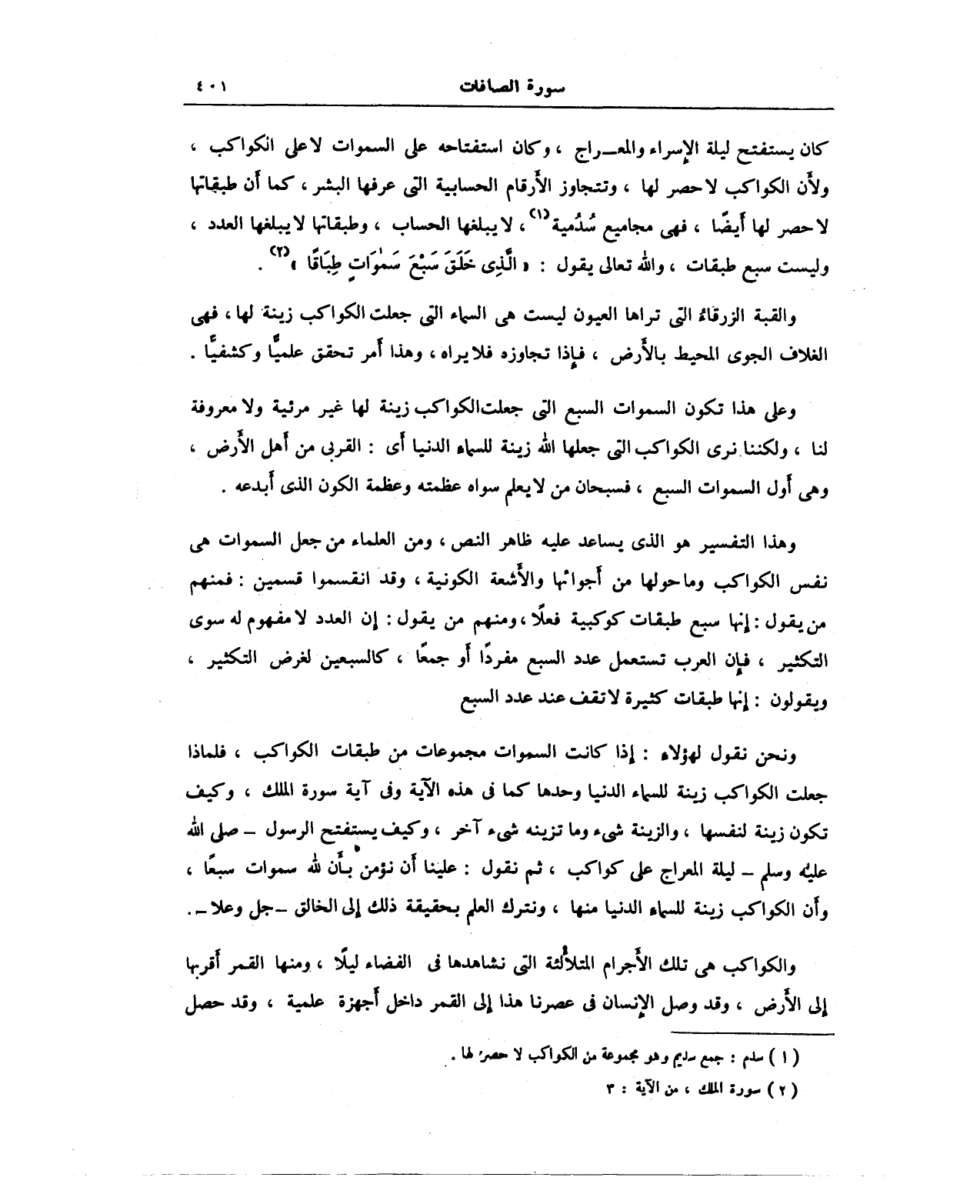 ونحن نقول لهؤلاء: إذا كانت السموات مجموعات من طبقات الكواكب، فلماذا جعلت الكواكب زينة للسماء الدنيا وحدها كما في هذه الآية وفي آية سورة الملك، وكيف تكون زينة لنفسها، والزينة شيء وما تزينه شيء آخر، وكيف يستفتح الرسول - صلى الله عليه وسلم - ليلة المعراج على كواكب، ثم نقول: علينا أن نؤمن بأن لله سموات سبعًا، وأن الكواكب زينة للسماء الدنيا منها، ونترك العلم بحقيقة ذلك إلى الخالق - جل وعلا -.