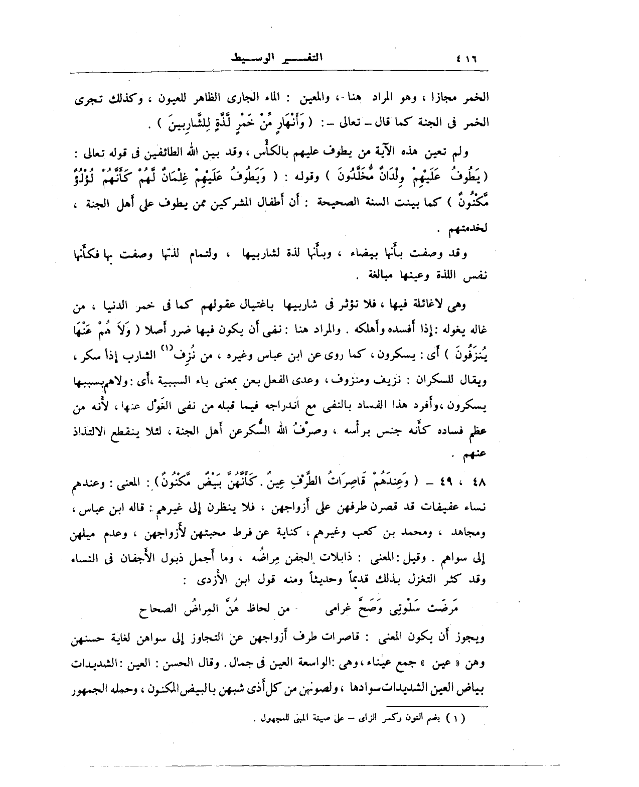 48، 49 - {وَعِنْدَهُمْ قَاصِرَاتُ الطَّرْفِ عِينٌ. كَأَنَّهُنَّ بَيْضٌ مَكْنُونٌ}: المعنى: وعندهم نساء عفيفات قد قصرن طرفهن على أزواجهن، فلا ينظرن إلى غيرهم: قاله ابن عباس، ومجاهد، ومحمد بن كعب وغيرهم، كناية عن فرط محبتهن لأزواجهن، وعدم ميلهن إلى سواهم. وقيل: المعنى: ذابلات الجفن مِراضُه، وما أجمل ذبول الأجفان في النساء وقد كثر التغزل بذلك قديمًا وحديثًا ومنه قول ابن الأزدي: