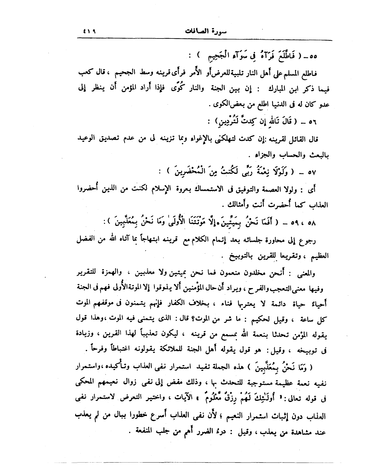 فاطلع المسلم على أهل النار تلبية للعرض أو الأمر فرأى قرينه وسط الجحيم، قال كعب فيما ذكر ابن المبارك: إن بين الجنة والنار كُوًى فإذا أراد المؤمن أن ينظر إلى عدو كان له في الدنيا اطلع من بعض الكوى.