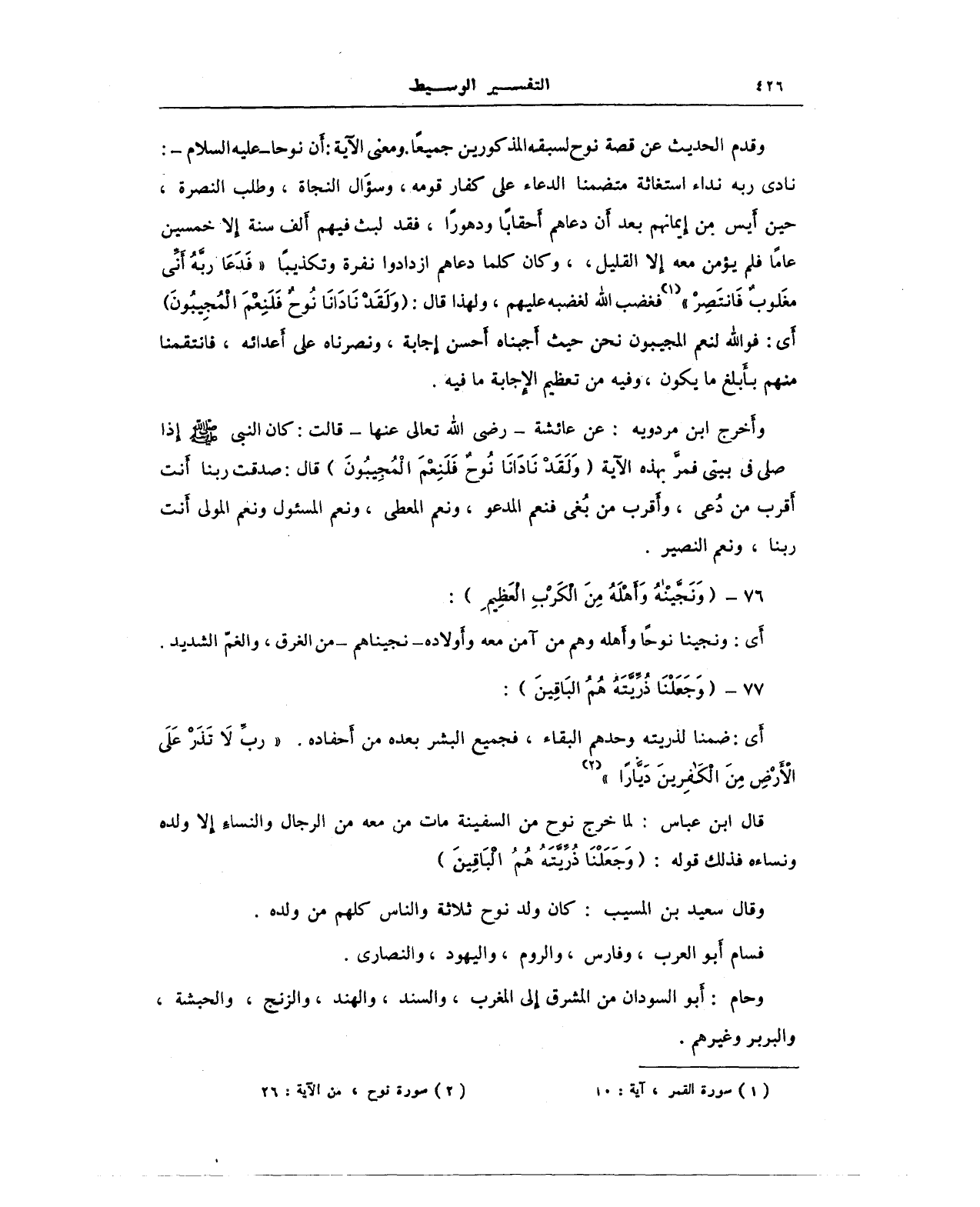 وقدم الحديث عن قصة نوح لسبقه المذكورين جميعًا. ومعنى الآية: أن نوحا - عليه السلام -: نادى ربه نداء استغاثة متضمنا الدعاء على كفار قومه، وسؤال النجاة، وطلب النصرة، حين أَيس من إيمانهم بعد أن دعاهم أحقابًا ودهورًا، فقد لبث فيهم ألف سنة إلا خمسين عامًا فلم يؤمن معه إلا القليل،، وكان كلما دعاهم ازدادوا نفرة وتكذيبًا {فَدَعَا رَبَّهُ أَنِّي مَغْلُوبٌ فَانْتَصِرْ (10)} (¬1) فغضب الله لغضبه عليهم، ولهذا قال: {وَلَقَدْ نَادَانَا نُوحٌ فَلَنِعْمَ الْمُجِيبُونَ (75)} أي: فوالله لنعم المجيبون نحن حيث أجبناه أحسن إجابة، ونصرناه على أعدائه، فانتقمنا منهم بأبلغ ما يكون، وفيه من تعظيم الإجابة ما فيه.