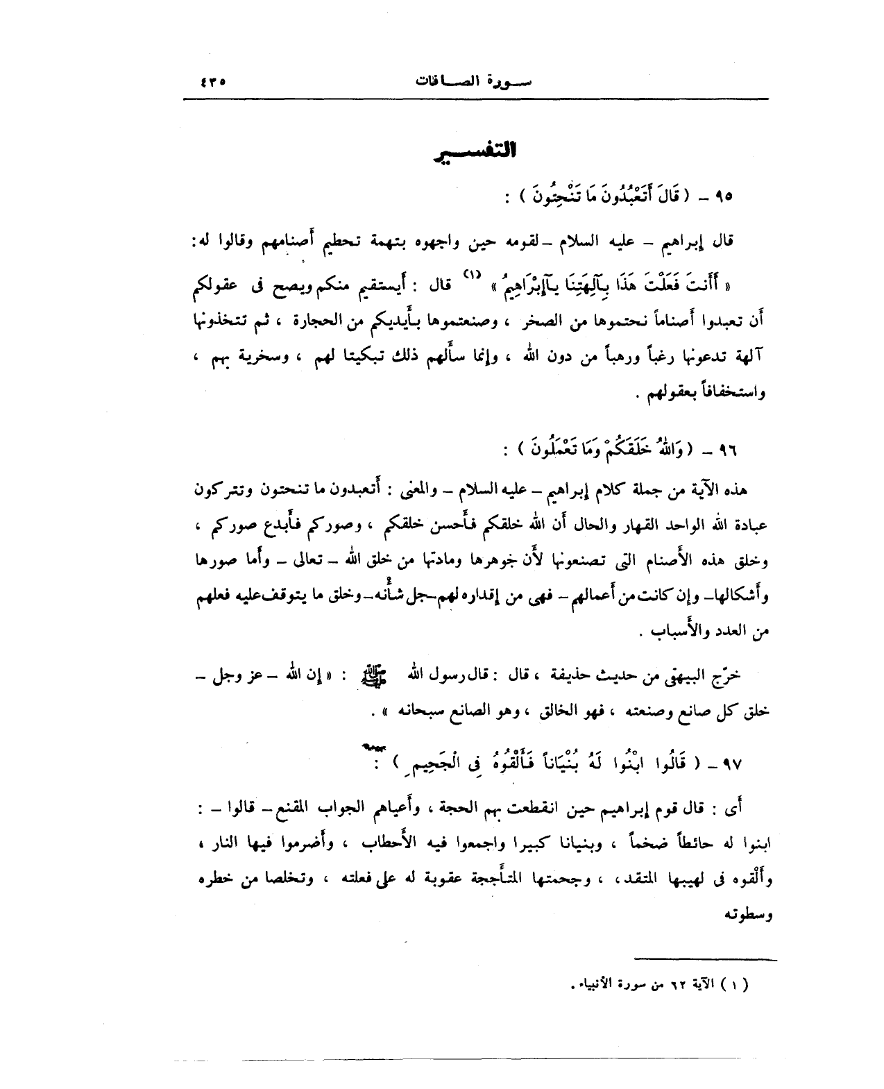 هذه الآية من جملة كلام إِبراهيم - عليه السلام - والمعنى: أَتعبدون ما تنحتون وتتركون عبادة الله الواحد القهار والحال أن الله خلقكم فأحسن خلقكم، وصوركم فأبدع صوركم، وخلق هذه الأَصنام التي تصنعونها لأَن جوهرها ومادتها من خلق الله - تعالى - وأَما صورها وأَشكالها - وإِن كانت من أَعمالهم - فهي من إِقداره لهم - جل شأَنه - وخلق ما يتوقف عليه فعلهم من العدد والأَسباب.