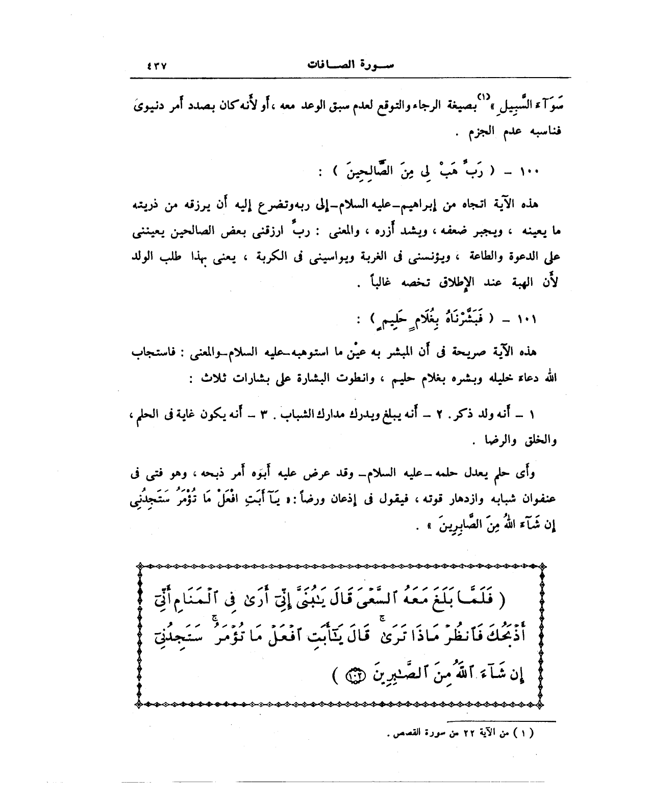 {فَلَمَّا بَلَغَ مَعَهُ السَّعْيَ قَالَ يَا بُنَيَّ إِنِّي أَرَى فِي الْمَنَامِ أَنِّي أَذْبَحُكَ فَانْظُرْ مَاذَا تَرَى قَالَ يَا أَبَتِ افْعَلْ مَا تُؤْمَرُ سَتَجِدُنِي إِنْ شَاءَ اللَّهُ مِنَ الصَّابِرِينَ (102)}