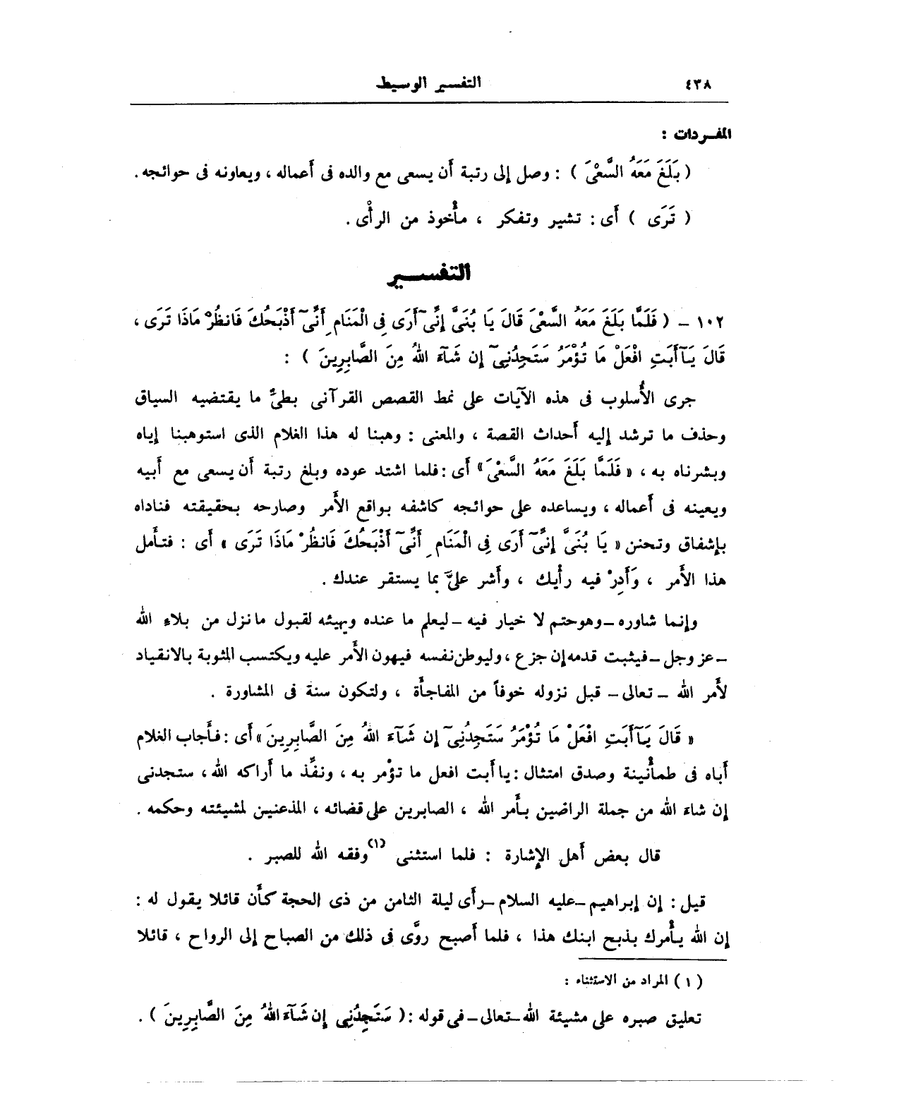 جرى الأُسلوب في هذه الآيات على نمط القصص القرآني بطيِّ ما يقتضيه السياق وحذف ما ترشد إليه أَحداث القصة، والمعنى: وهبنا له هذا الغلام الذي استوهبنا إياه وبشرناه به، {فَلَمَّا بَلَغَ مَعَهُ السَّعْيَ} أَي: فلما اشتد عوده وبلغ رتبة أَن يسعى مع أَبيه ويعينه في أعماله، ويساعده على حوائجه كاشفه بواقع الأمر وصارحه بحقيقته فناداه بإِشفاق وتحنن {يَا بُنَيَّ إِنِّي أَرَى فِي الْمَنَامِ أَنِّي أَذْبَحُكَ فَانْظُرْ مَاذَا تَرَى} أَي: فتأَمل هذا الأَمر، وَأَدِرْ فيه رأْيك، وأَشر عليَّ بما يستقر عندك.