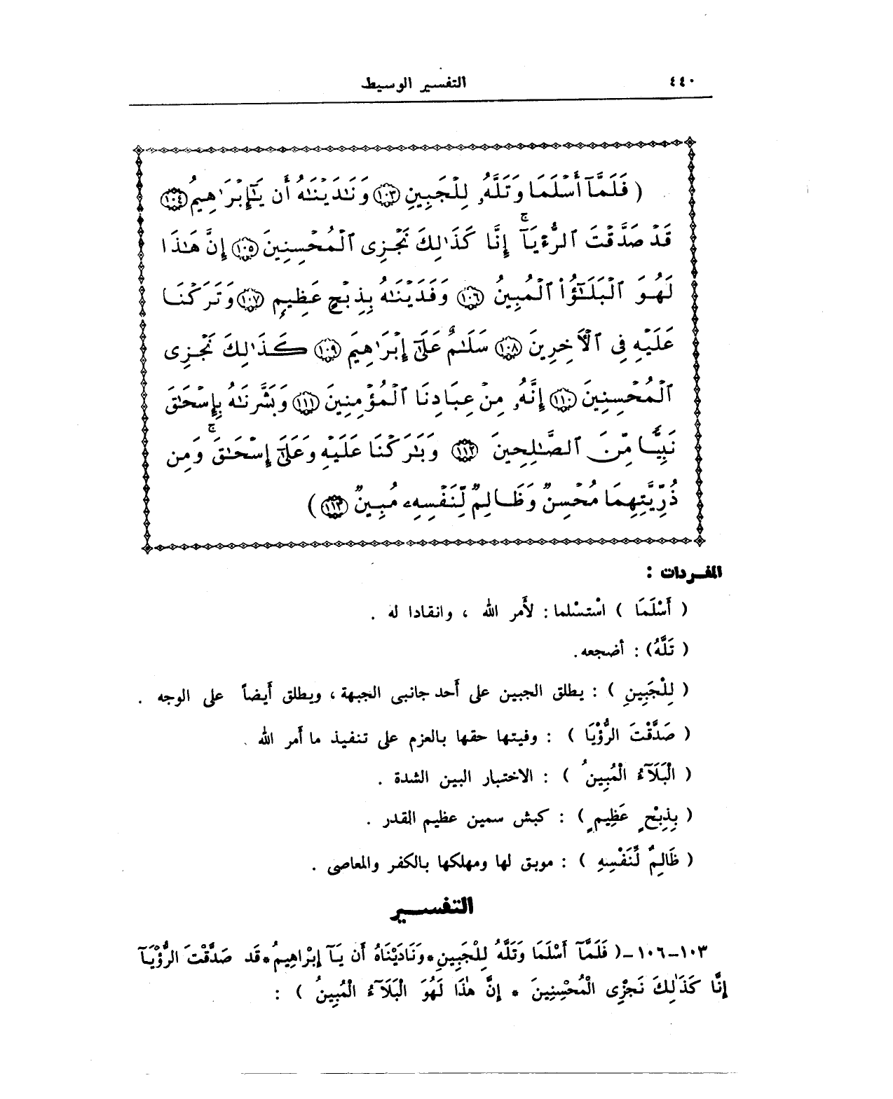 {فَلَمَّا أَسْلَمَا وَتَلَّهُ لِلْجَبِينِ (103) وَنَادَيْنَاهُ أَنْ يَا إِبْرَاهِيمُ (104) قَدْ صَدَّقْتَ الرُّؤْيَا إِنَّا كَذَلِكَ نَجْزِي الْمُحْسِنِينَ (105) إِنَّ هَذَا لَهُوَ الْبَلَاءُ الْمُبِينُ (106) وَفَدَيْنَاهُ بِذِبْحٍ عَظِيمٍ (107) وَتَرَكْنَا عَلَيْهِ فِي الْآخِرِينَ (108) سَلَامٌ عَلَى إِبْرَاهِيمَ (109) كَذَلِكَ نَجْزِي الْمُحْسِنِينَ (110) إِنَّهُ مِنْ عِبَادِنَا الْمُؤْمِنِينَ (111) وَبَشَّرْنَاهُ بِإِسْحَاقَ نَبِيًّا مِنَ الصَّالِحِينَ (112) وَبَارَكْنَا عَلَيْهِ وَعَلَى إِسْحَاقَ وَمِنْ ذُرِّيَّتِهِمَا مُحْسِنٌ وَظَالِمٌ لِنَفْسِهِ مُبِينٌ (113)}