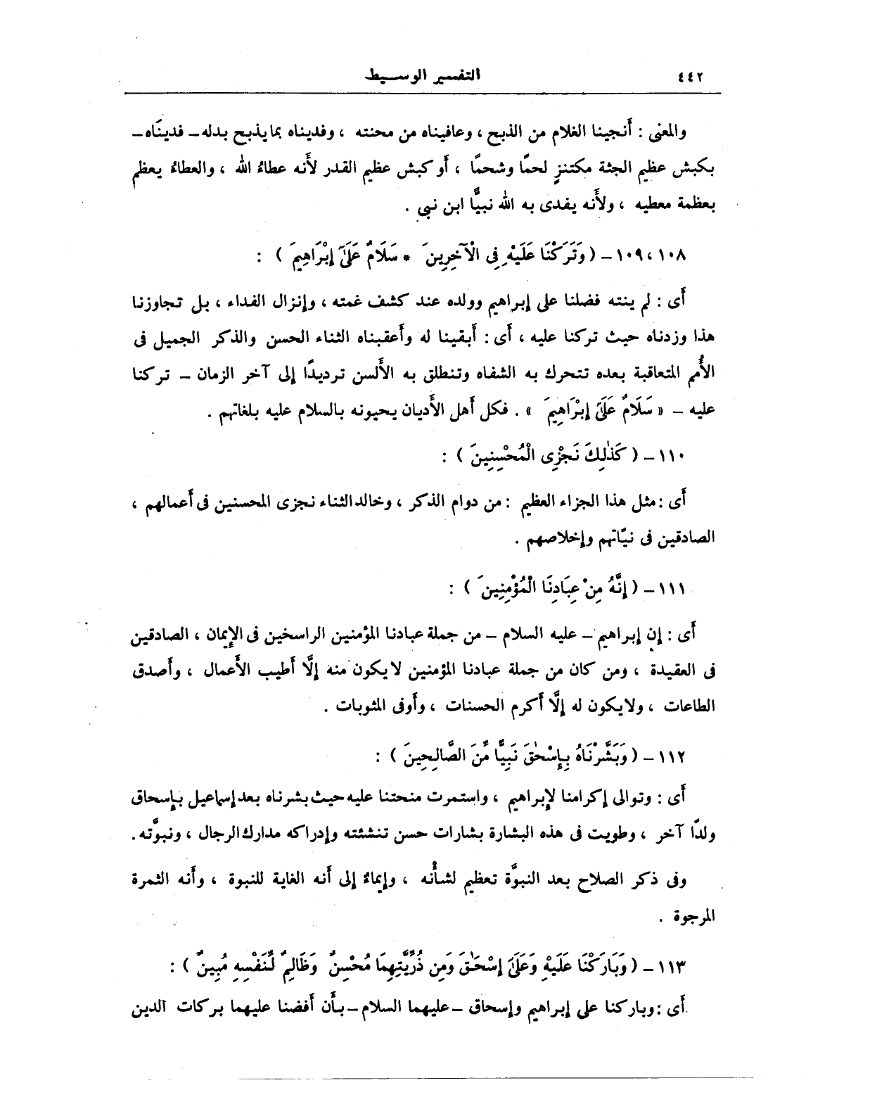 أَي: لم ينته فضلنا على إبراهيم وولده عند كشف غمته، وإنزال الفداء، بل تجاوزنا هذا وزدناه حيث تركنا عليه، أَي: أَبقينا له وأعقبناه الثناء الحسن والذكر الجميل في الأُمم المتعاقبة بعده تتحرك به الشفاه وتنطلق به الأَلسن ترديدًا إلى آخر الزمان - تركنا عليه - {سَلَامٌ عَلَى إِبْرَاهِيمَ}. فكل أَهل الأَديان يحيونه بالسلام عليه بلغاتهم.