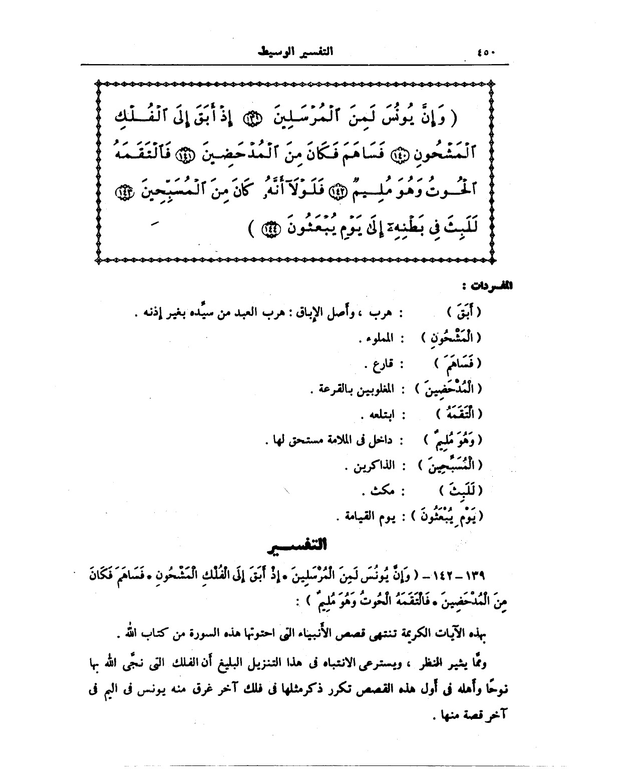 {وَإِنَّ يُونُسَ لَمِنَ الْمُرْسَلِينَ (139) إِذْ أَبَقَ إِلَى الْفُلْكِ الْمَشْحُونِ (140) فَسَاهَمَ فَكَانَ مِنَ الْمُدْحَضِينَ (141) فَالْتَقَمَهُ الْحُوتُ وَهُوَ مُلِيمٌ (142) فَلَوْلَا أَنَّهُ كَانَ مِنَ الْمُسَبِّحِينَ (143) لَلَبِثَ فِي بَطْنِهِ إِلَى يَوْمِ يُبْعَثُونَ (144)}