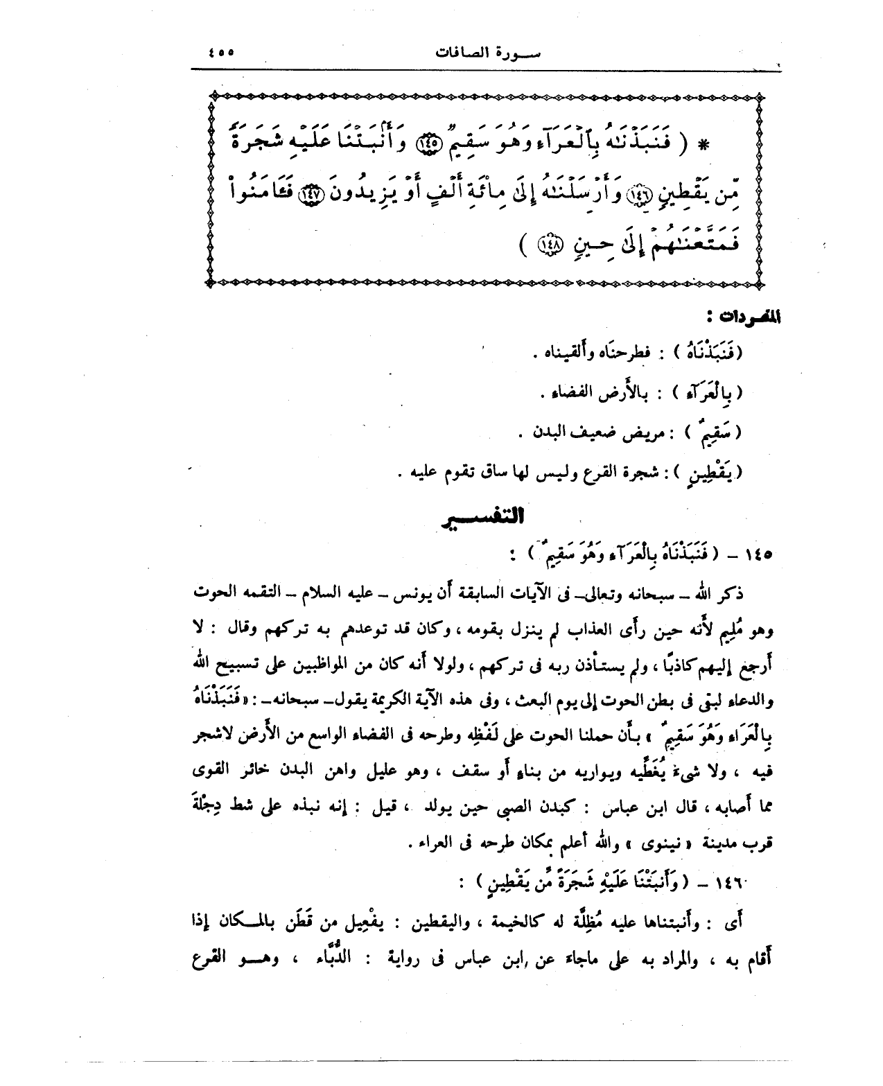 ذكر الله - سبحانه وتعالى - في الآيات السابقة أن يونس - عليه السلام - التقمه الحوت وهو مُلِيم لأَنه حين رأى العذاب لم ينزل بقومه، وكان قد توعدهم به تركهم وقال: لا أَرجع إِليهم كاذبًا, ولم يستأذن ربه في تركهم، ولولا أنه كان من المواظبين على تسبيح الله والدعاءِ لبقي في بطن الحوت إِلى يوم البعث، وفي هذه الآية الكريمة يقول - سبحان -: {فَنَبَذْنَاهُ بِالْعَرَاءِ وَهُوَ سَقِيمٌ} بأَن حملنا الحوت على لَفْظِه وطرحه في الفضاءِ الواسع من الأَرض لا شجر فيه، ولا شىءَ يُغَطِّيه ويواريه من بناءٍ أَو سقف، وهو عليل واهن البدن خائر القوى مما أصابه، قال ابن عباس: كبدن الصبي حين يولد، قيل: إنه نبذه كل شط دِجْلة قرب مدينة "نينوى" والله أعلم بمكان طرحه في العراء.