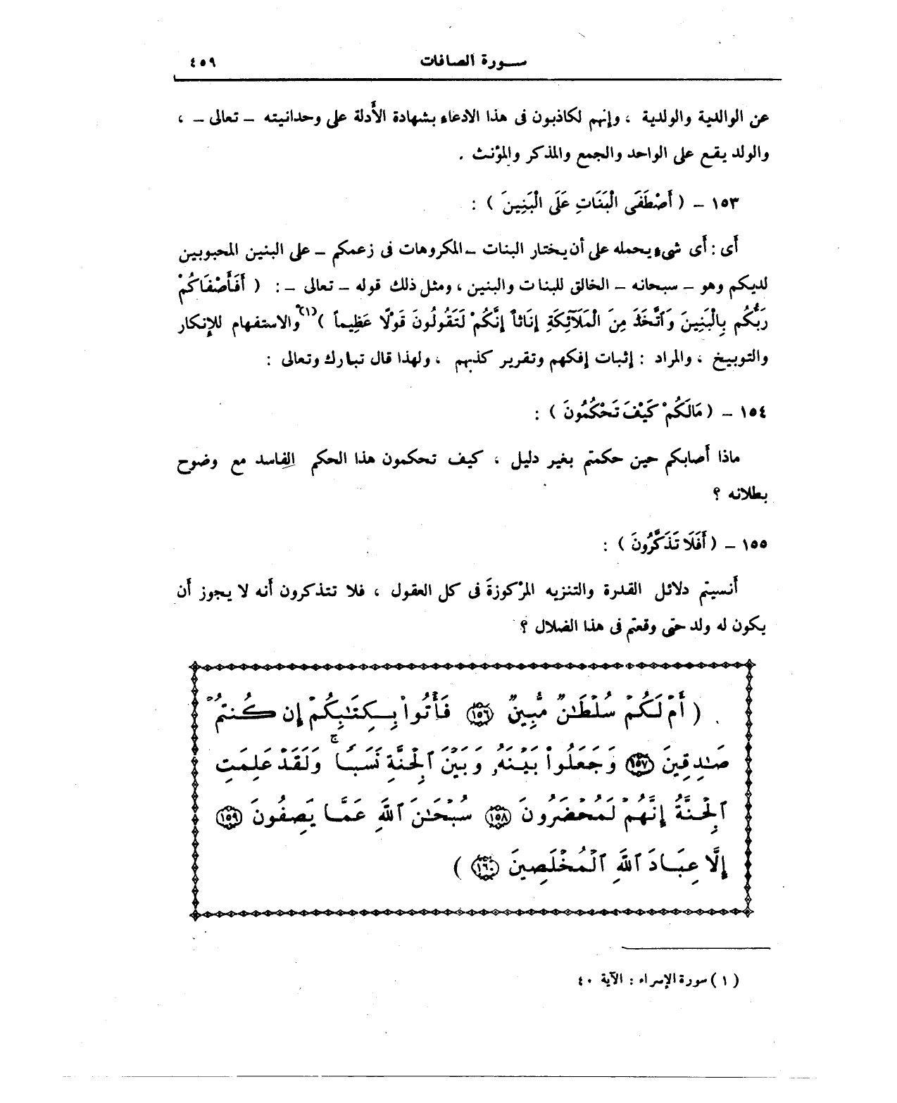 {أَمْ لَكُمْ سُلْطَانٌ مُبِينٌ (156) فَأْتُوا بِكِتَابِكُمْ إِنْ كُنْتُمْ صَادِقِينَ (157) وَجَعَلُوا بَيْنَهُ وَبَيْنَ الْجِنَّةِ نَسَبًا وَلَقَدْ عَلِمَتِ الْجِنَّةُ إِنَّهُمْ لَمُحْضَرُونَ (158) سُبْحَانَ اللَّهِ عَمَّا يَصِفُونَ (159) إِلَّا عِبَادَ اللَّهِ الْمُخْلَصِينَ (160)}