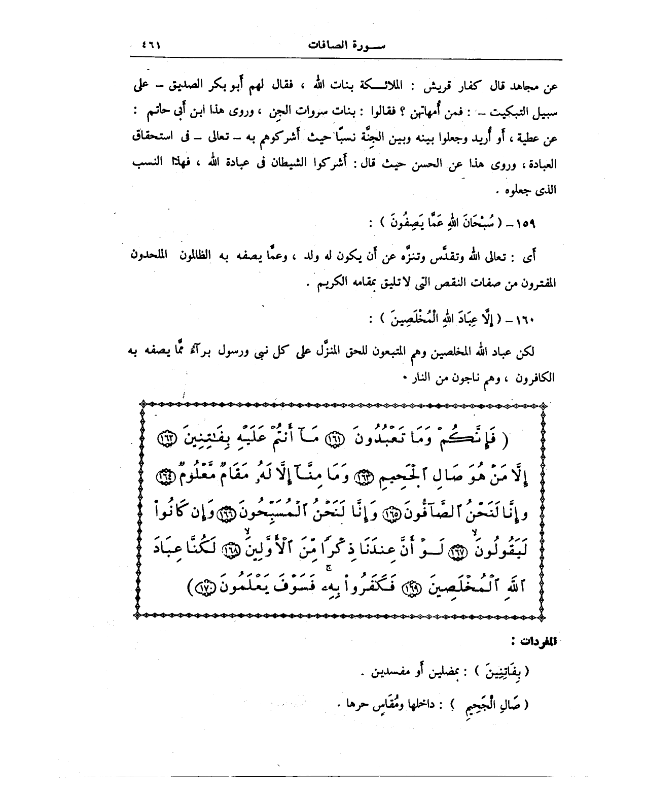{فَإِنَّكُمْ وَمَا تَعْبُدُونَ (161) مَا أَنْتُمْ عَلَيْهِ بِفَاتِنِينَ (162) إِلَّا مَنْ هُوَ صَالِ الْجَحِيمِ (163) وَمَا مِنَّا إِلَّا لَهُ مَقَامٌ مَعْلُومٌ (164) وَإِنَّا لَنَحْنُ الصَّافُّونَ (165) وَإِنَّا لَنَحْنُ الْمُسَبِّحُونَ (166) وَإِنْ كَانُوا لَيَقُولُونَ (167) لَوْ أَنَّ عِنْدَنَا ذِكْرًا مِنَ الْأَوَّلِينَ (168) لَكُنَّا عِبَادَ اللَّهِ الْمُخْلَصِينَ (169) فَكَفَرُوا بِهِ فَسَوْفَ يَعْلَمُونَ (170)}