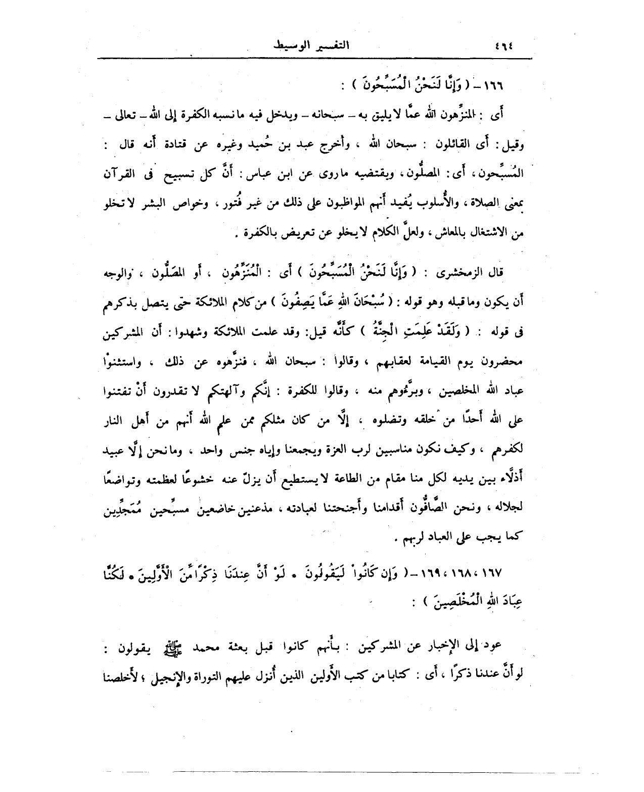 قال الزمخشري: {وَإِنَّا لَنَحْنُ الْمُسَبِّحُونَ} أَي: الْمُنَزِّهُن، أو المصَلُّون, والوجه أَن يكون وما قبله وهو قوله: {سُبْحَانَ اللَّهِ عَمَّا يَصِفُونَ} من كلام الملائكة حتى يتصل بذكرهم في قوله: {وَلَقَدْ عَلِمَتِ الْجِنَّةُ} كأَنَّه قيل: وقد علمت الملائكة وشهدوا: أَن المشركين محضرون يوم القيامة لعقابهم، وقالوا: سبحان الله، فنزِّهوه عن ذلك، واستثنوْا عباد الله المخلصين، وبرَّءُوهم منه، وقالوا للكفرة: إنَّكم وآلهتكم لا تقدرون أنْ تفتنوا على الله أحدًا من خلقه وتضلوه، إِلاَّ من كان مثلكم ممن علم الله أَنهم من أَهل النار لكفرهم، وكيف نكون مناسبين لرب العزة ويجمعنا وإياه جنس واحد، وما نحن إلاَّ عبيد أَذلاَّء بين يديه لكل منا مقام من الطاعة لا يستطيع أَن يزلّ عنه خشوعًا لعظمته وتواضعًا لجلاله، ونحن الصَّافُّون أَقدامنا وأجنحتنا لعبادته، مذعنين خاضعين مسبِّحين مُمَجِّدِين كما يجب على العباد لربهم.